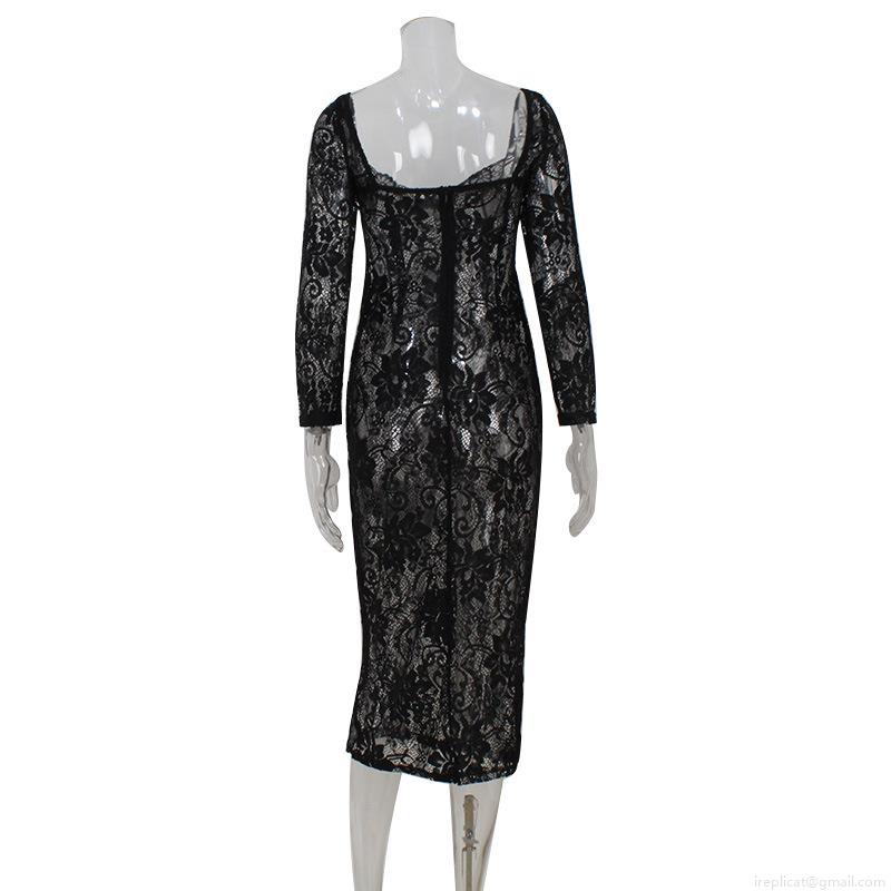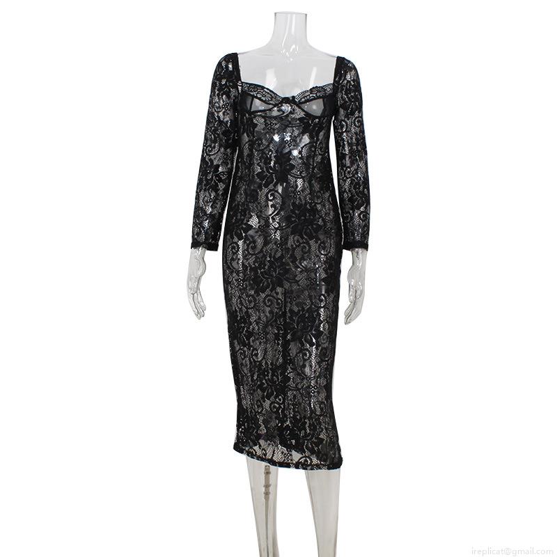 Women Sexy Lace Long Sleeve Maxi Dress Elegant Square Neck Low Cut Bodycon See-Through Party Evening Clubwear Black Slim Fit Celebrity Style Fashion