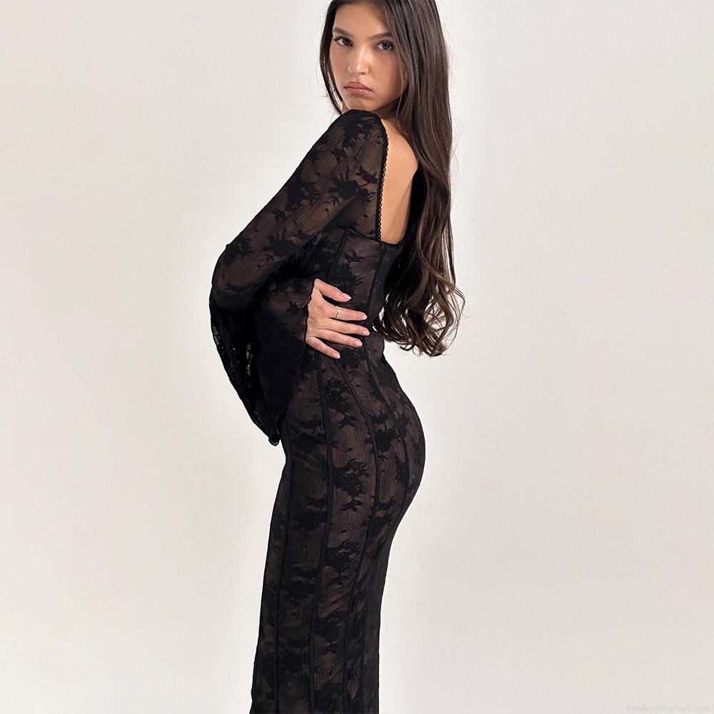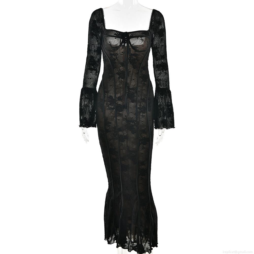 Women Sexy Lace Maxi Dress Square Neck Flare Sleeve Backless Bodycon Party Evening Gown Floral Embroidery Long Sleeve Fish Tail Elegant Dress