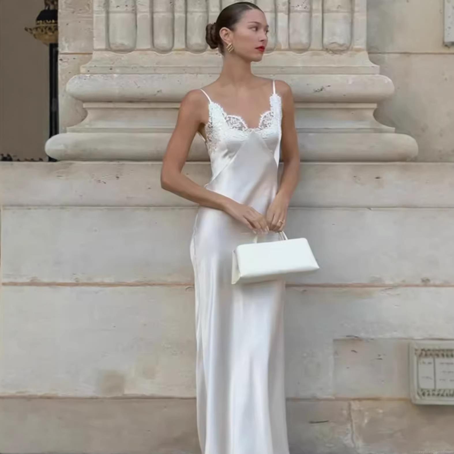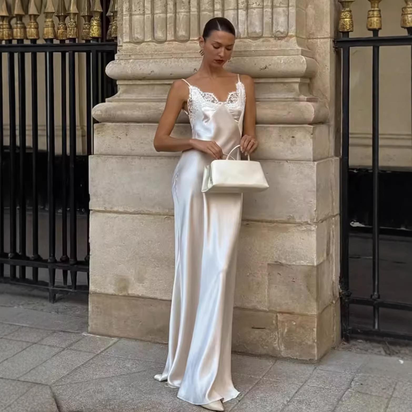 Women Sexy Lace Patchwork Satin Maxi Dress Spaghetti Strap V Neck Backless Silk Like Fishtail Long Party Dress For Summer Vacation Ladies
