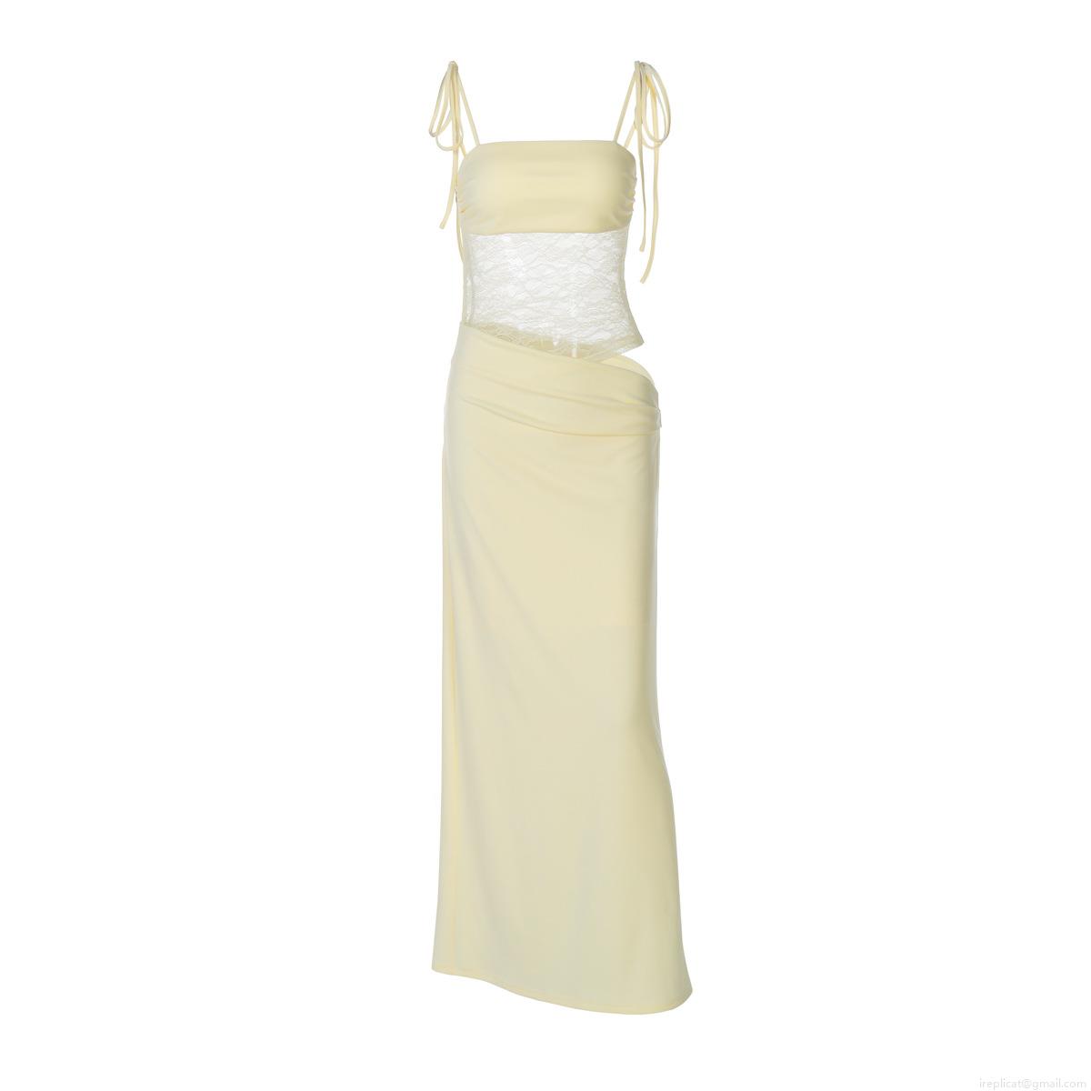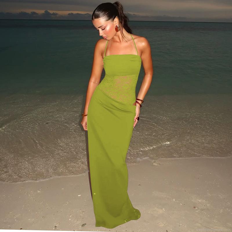 Women Sexy Lace Splicing Camisole Maxi Dress Elegant Hollow Out Spaghetti Strap Backless Slim Fit Evening Party Long Dress