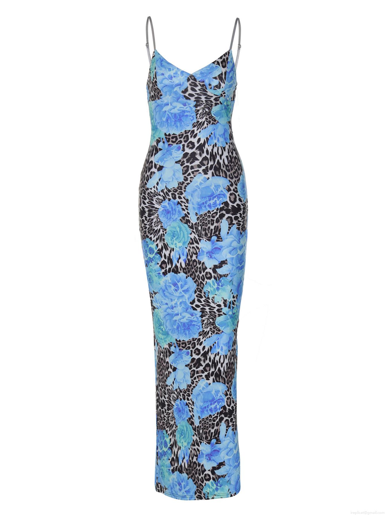 • Women Sexy Leopard Blue Floral Print Maxi Dress Adjustable Sling V-Neck Slim Fit Long Dress Street Style Vacation Summer Party Sleeveless Spliced Sundress