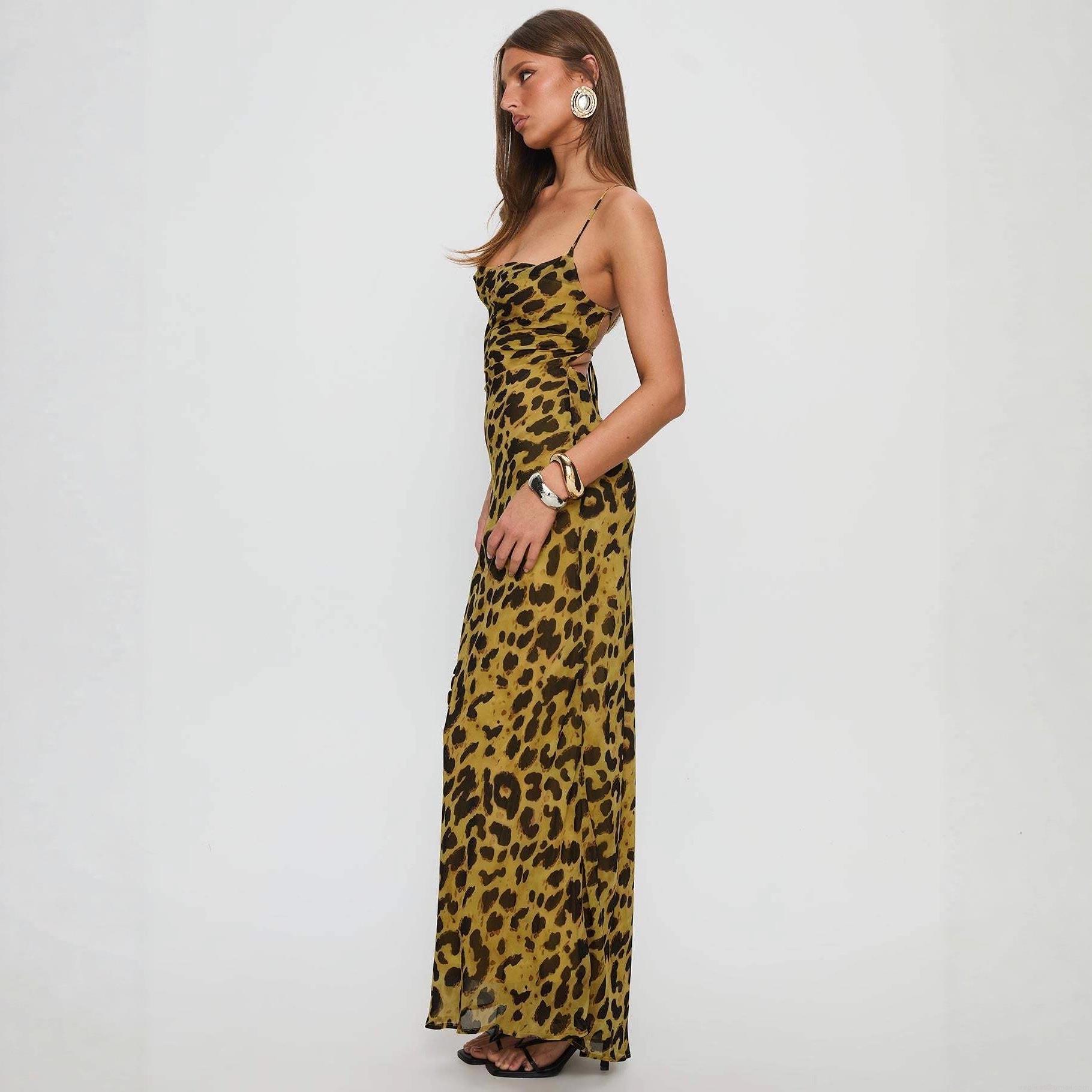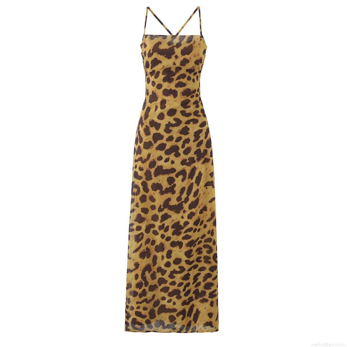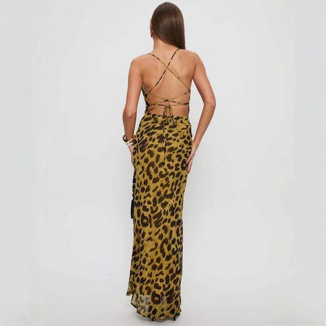 • Women Sexy Leopard Print Spaghetti Strap Backless Maxi Dress Stretchy Polyester Bodycon Party Dress With Cross Tie Back Detail