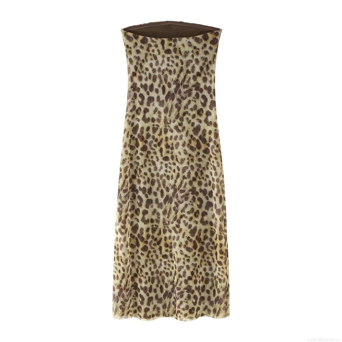 • Women Sexy Leopard Print Tube Top Maxi Dress Slim Fit Side Slit Mesh Polyester Bodycon Long Dress for Party Evening Club