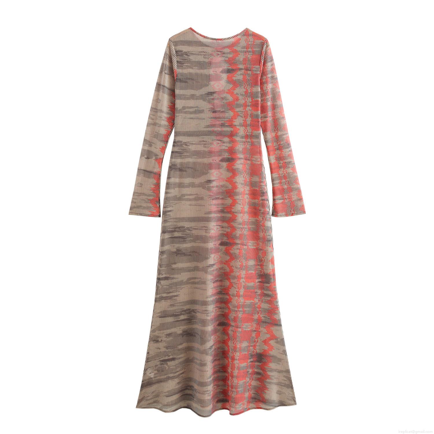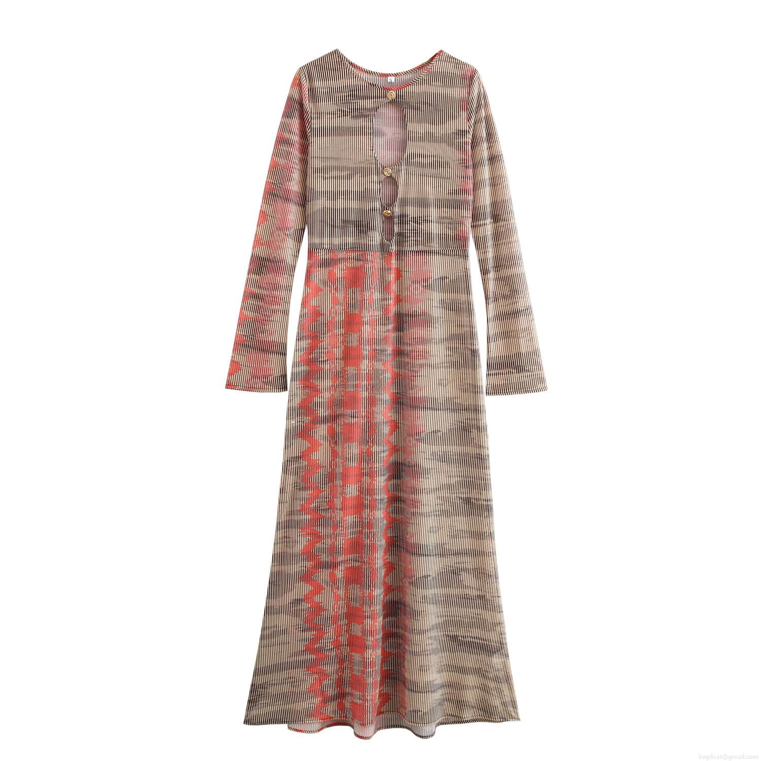 • Women Sexy Long Sleeve Maxi Dress Mesh Polyester Hollow Out Keyhole Round Neck Striped Geometric Print Bodycon Slim Fit Party Clubwear Dress