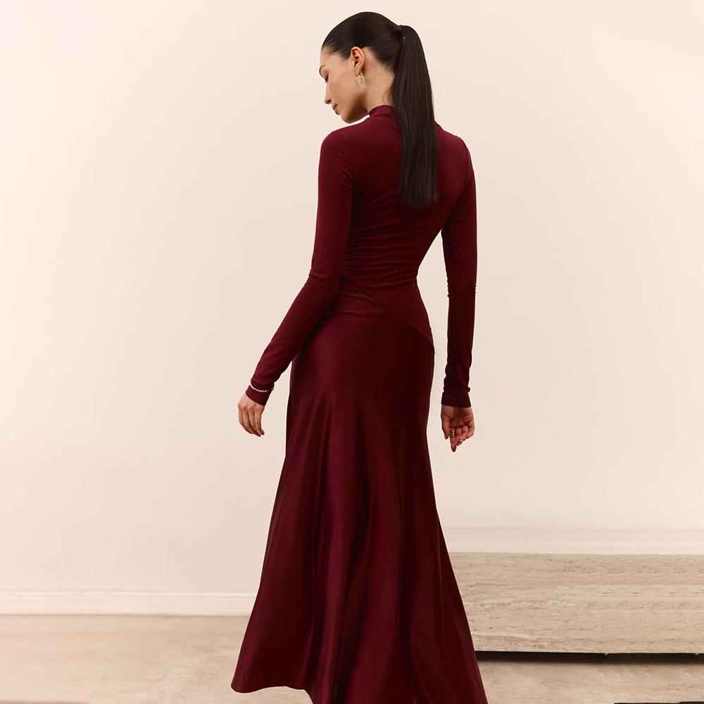 • Women Sexy Long Sleeve Mock Neck Patchwork Maxi Dress Elegant Slim Fit Ruching Satin Milk Silk Bodycon Club Party Evening Long Dress