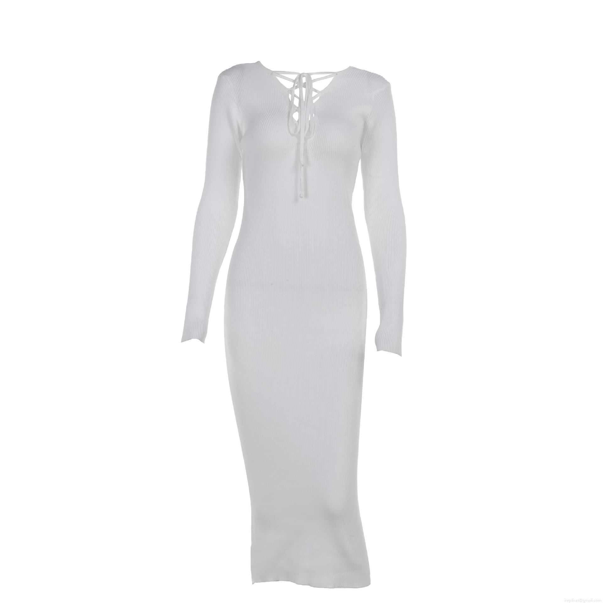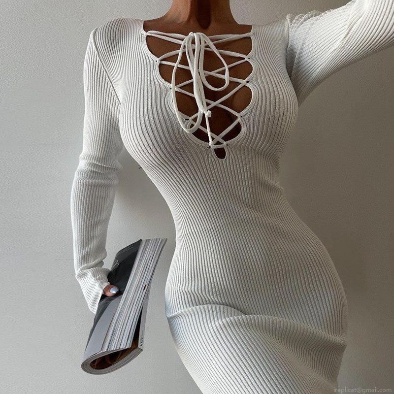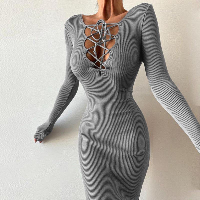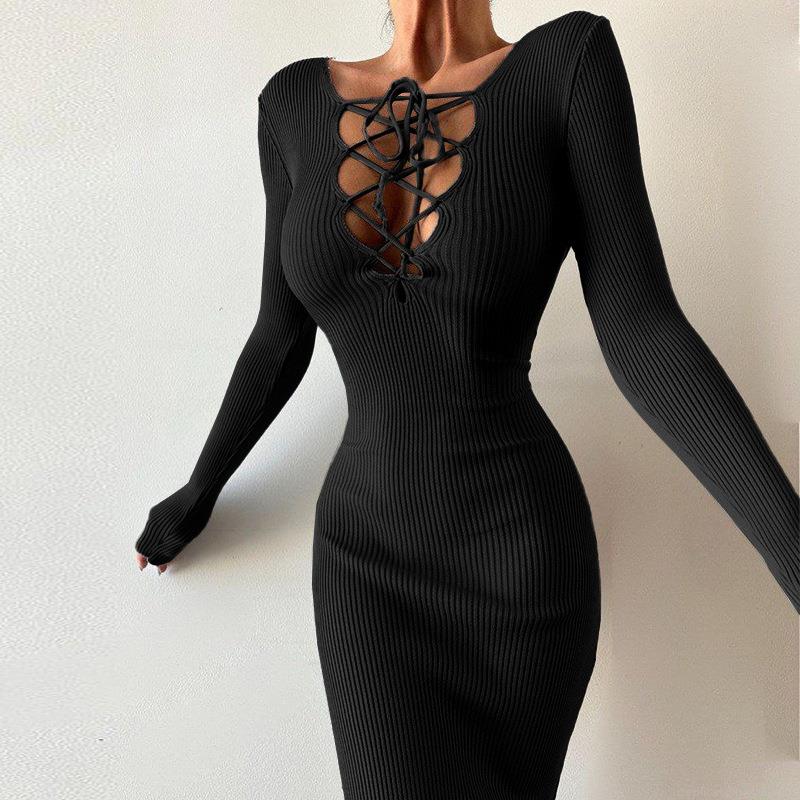 • Women Sexy Long Sleeve Ribbed Knit Maxi Dress Cross Wrap Lace Up Hollow Out Bodycon Mermaid Dress For Club Party Night Out Sexy Streetwear