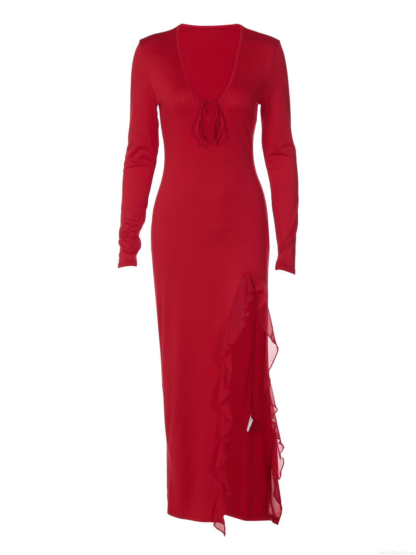 • Women Sexy Maxi Dress Elegant Deep U Neck Tie Up Side Slit Ruffle Long Sleeve Bodycon Dresses For Party Formal Evening Wedding Guest Night Out Dress