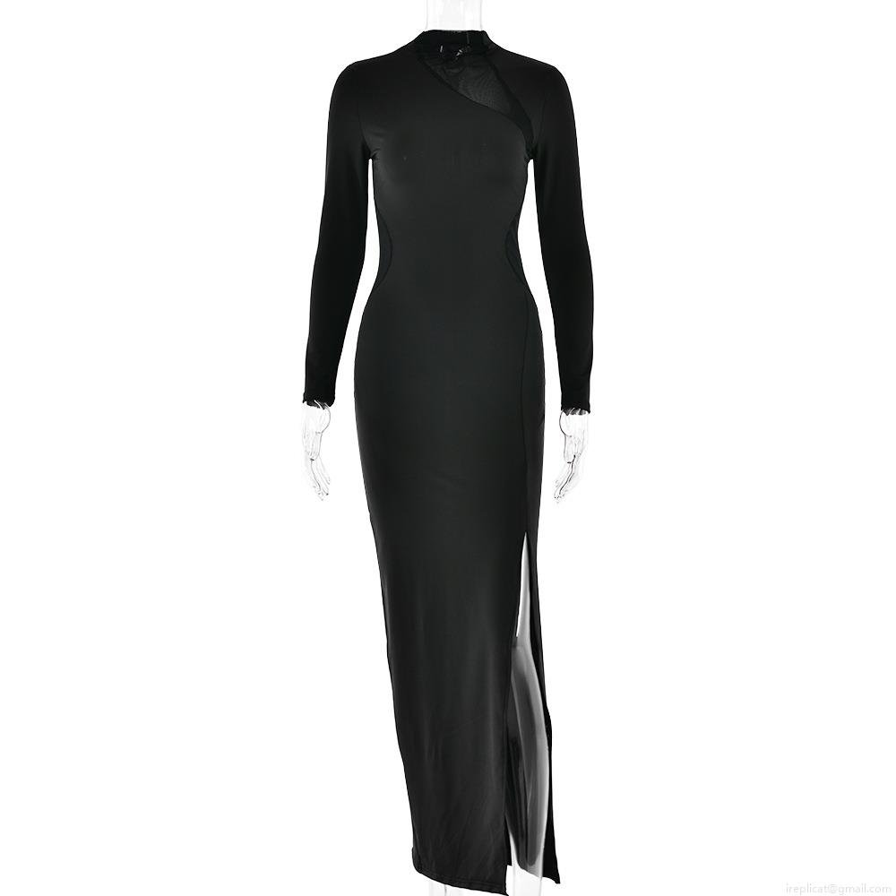• Women Sexy Mesh Patchwork Long Sleeve Maxi Dress High Slit Tight Fit Solid Color Party Evening Clubwear Bodycon Gown With Transparent Details