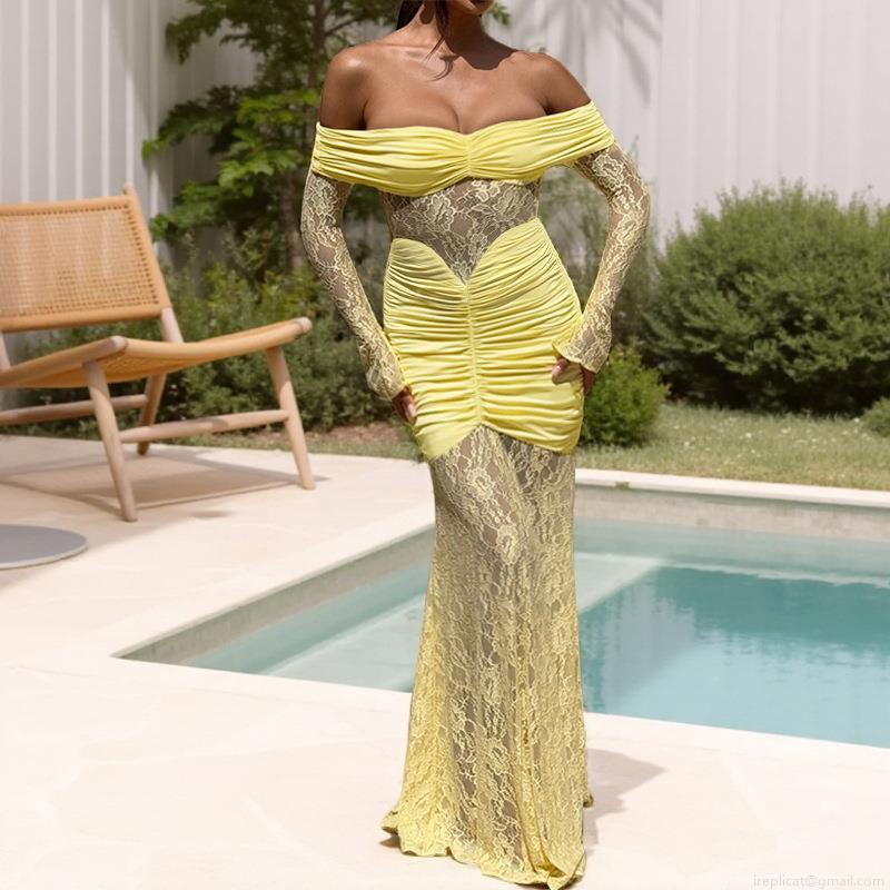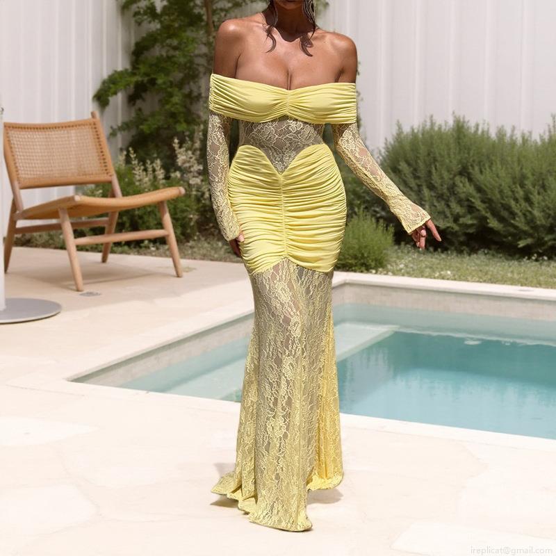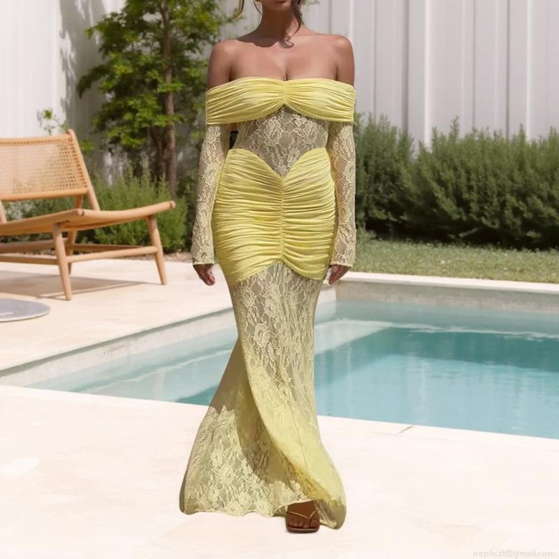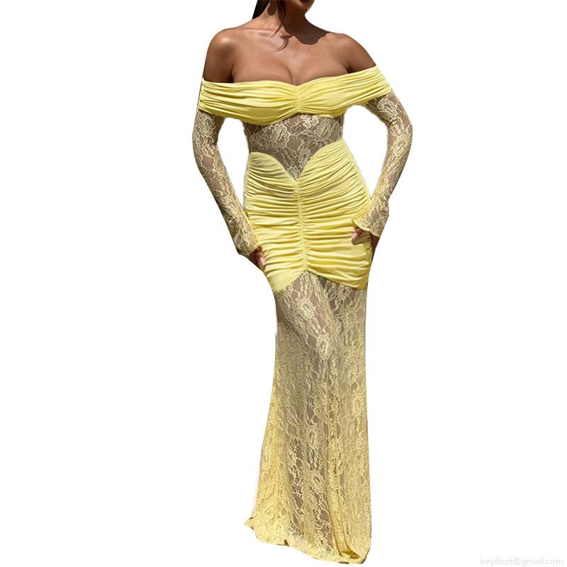 Women Sexy Off Shoulder Lace Patchwork Maxi Dress Elegant Ruched Bodycon Fish Tail Long Sleeve Polyester Spandex Evening Party Dress