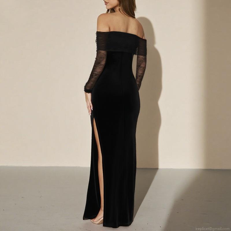 • Women Sexy Off Shoulder Lace Patchwork Maxi Dress Slim Fit High Slit Long Sleeve Perspective Black Evening Party Gown