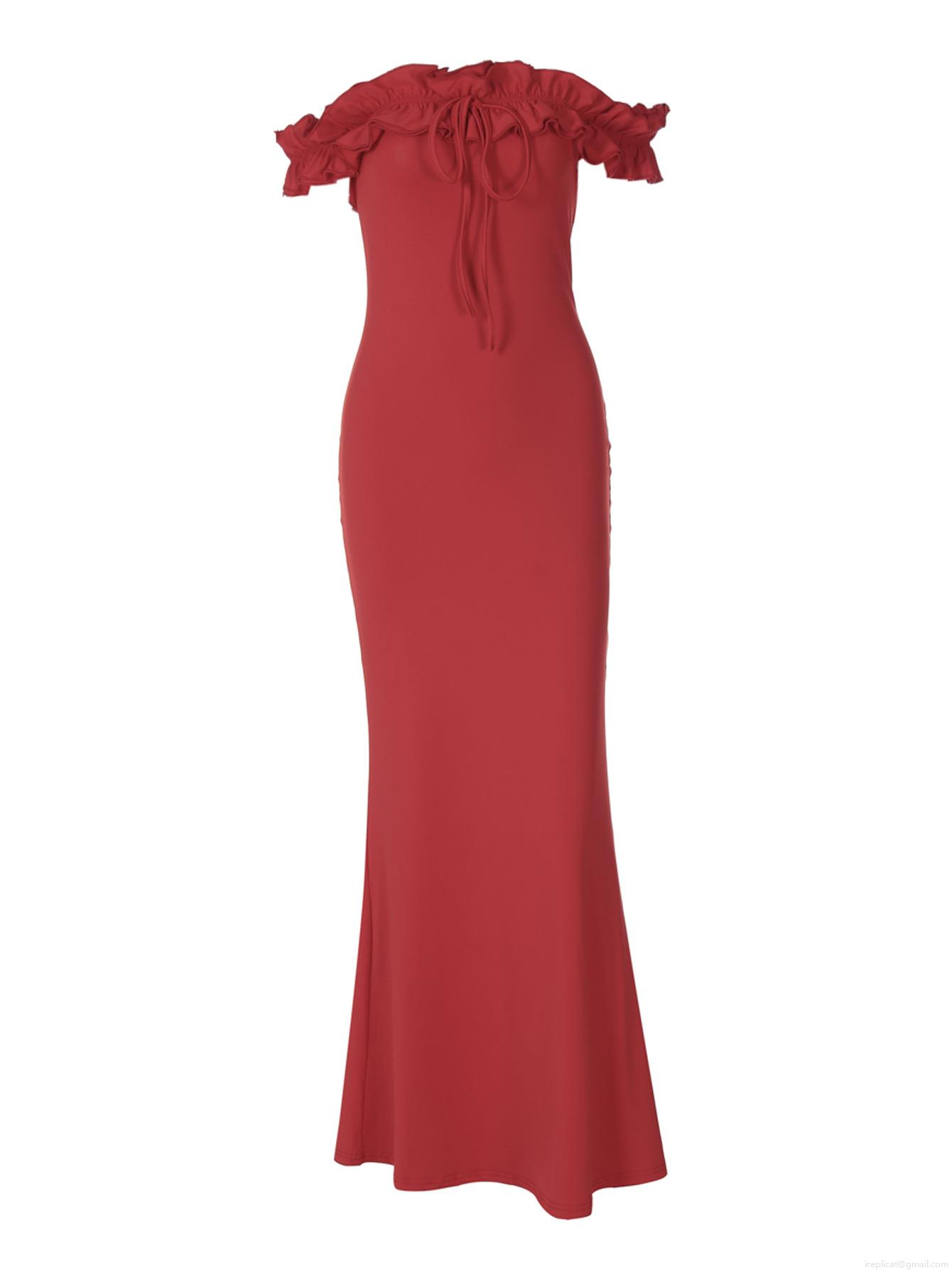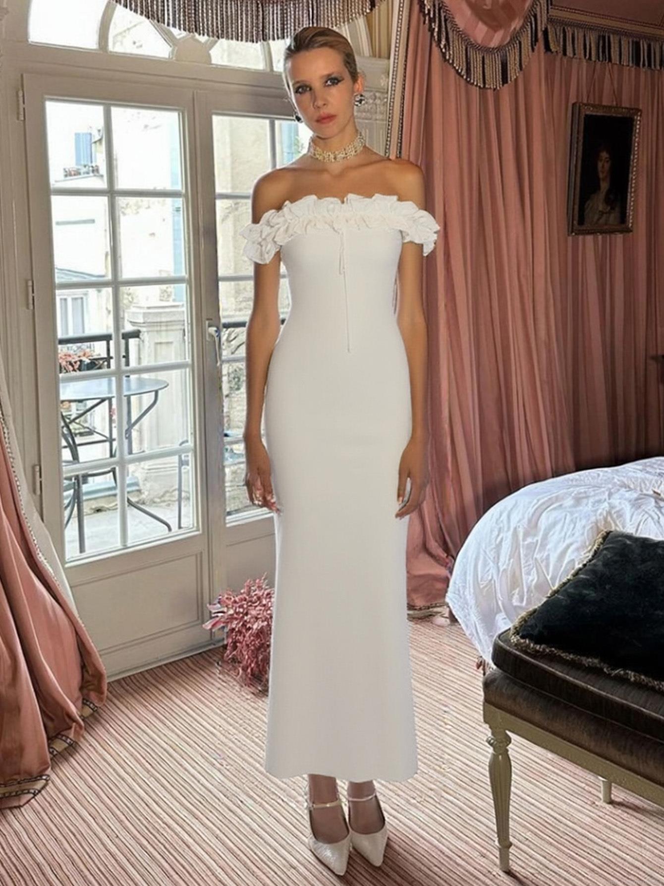 • Women Sexy Off Shoulder Ruffle Trim Maxi Dress Elegant Solid Color Tie Front Slim Fit Polyester Spandex Evening Party Bodycon Dress