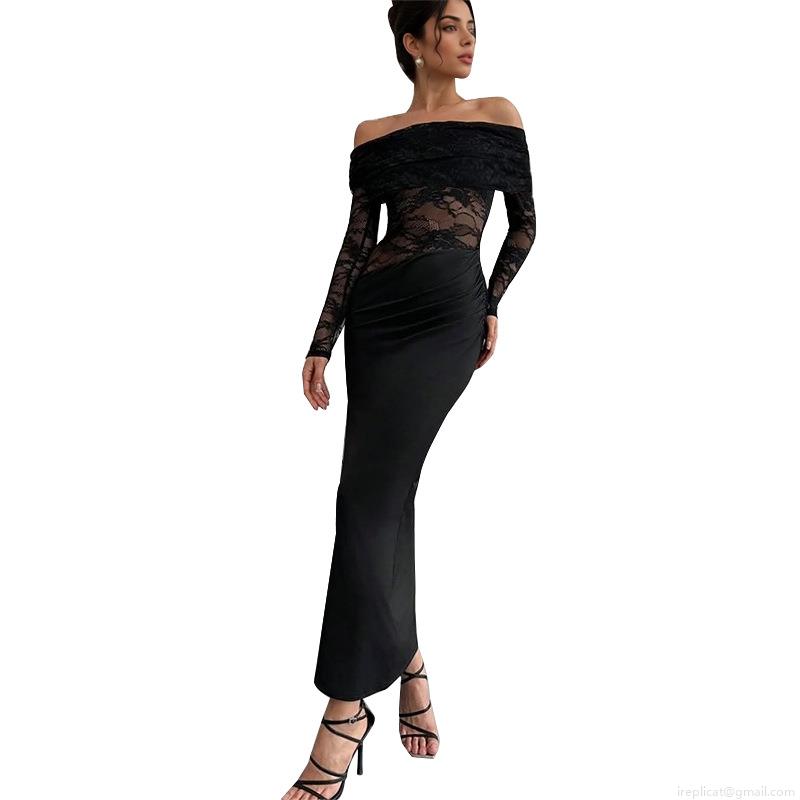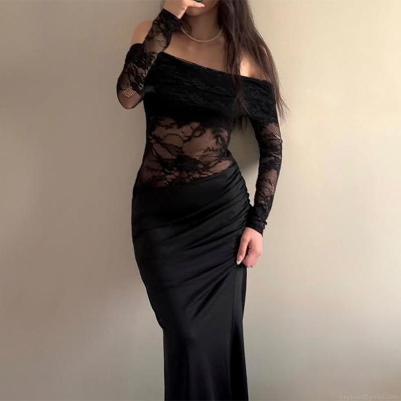 • Women Sexy Off-Shoulder Lace Patchwork Maxi Dress Elegant Long Sleeve Bodycon Fish Tail Evening Party Dress Slim Fit Black Clubwear Long Dress