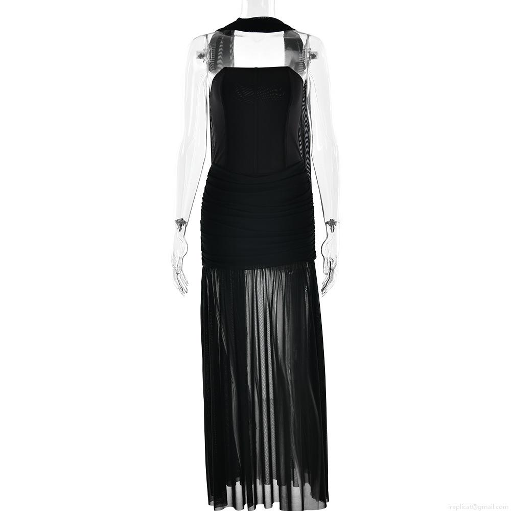 • Women Sexy Off-Shoulder Mesh Maxi Dress Elegant Milk Silk Ruched Bodycon Evening Party Gown With Scarf Accessory High Waist Sleeveless Long Dress
