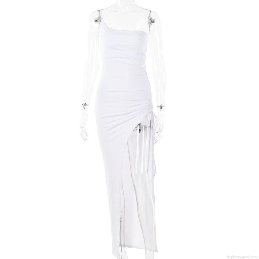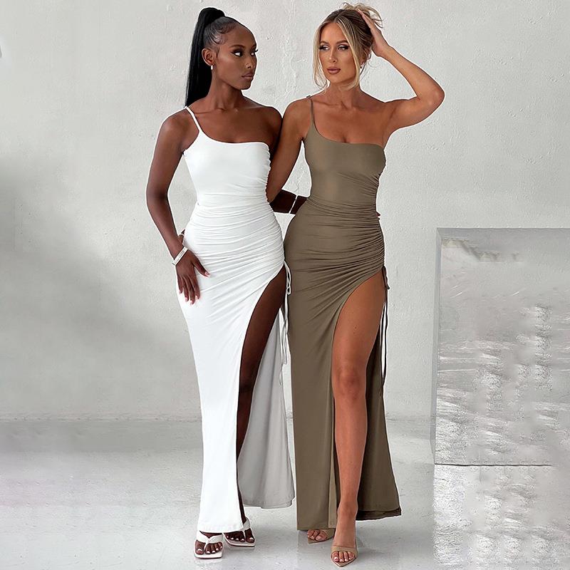 Women Sexy One Shoulder High Slit Maxi Dress Ruched Drawstring Bodycon Long Party Evening Dress Sleeveless Polyester Solid Clubwear Slim Fit Gown