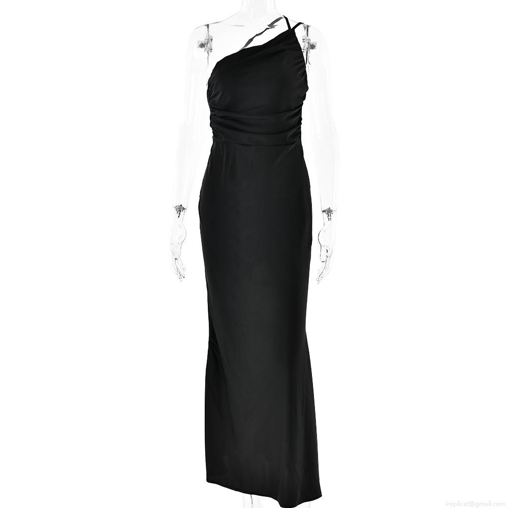 • Women Sexy One Shoulder Ruched Satin Maxi Dress Elegant Backless Slim Fit Evening Party Wedding Guest Long Dress