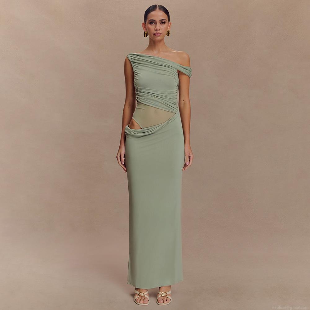 Women Sexy One-Shoulder Hollow Out Pleated Maxi Dress Polyester Spandex Mesh Patchwork Slim Fit Sleeveless Party Evening Long Dress
