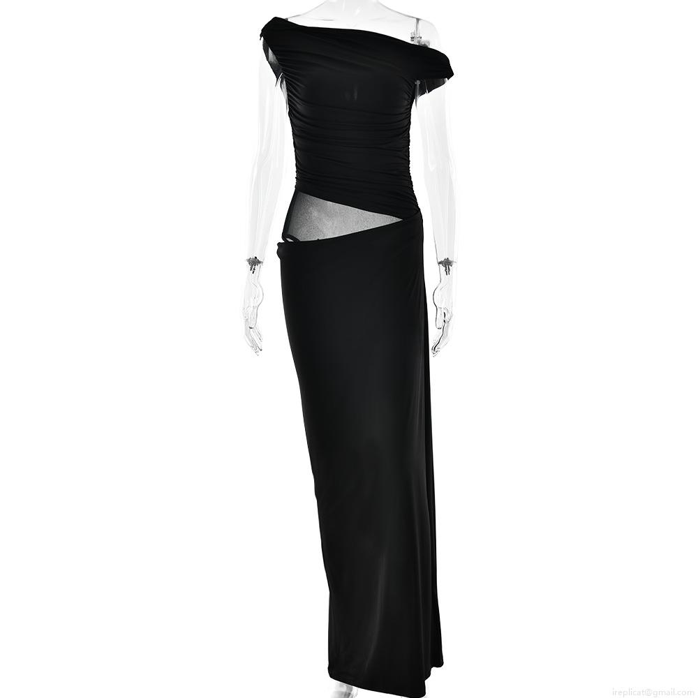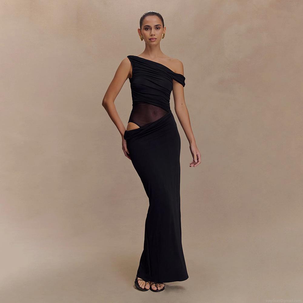 • Women Sexy One-Shoulder Hollow Out Pleated Maxi Dress Polyester Spandex Mesh Patchwork Slim Fit Sleeveless Party Evening Long Dress