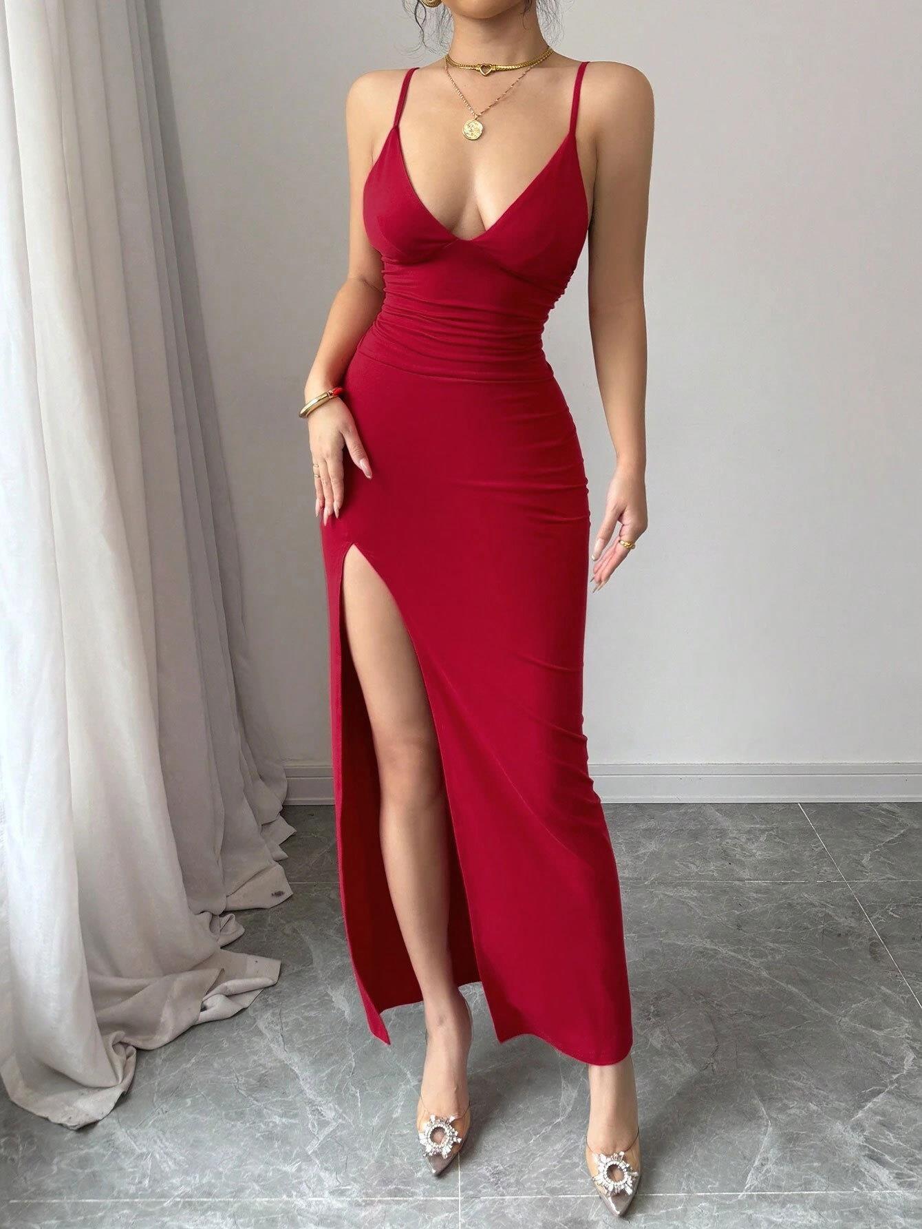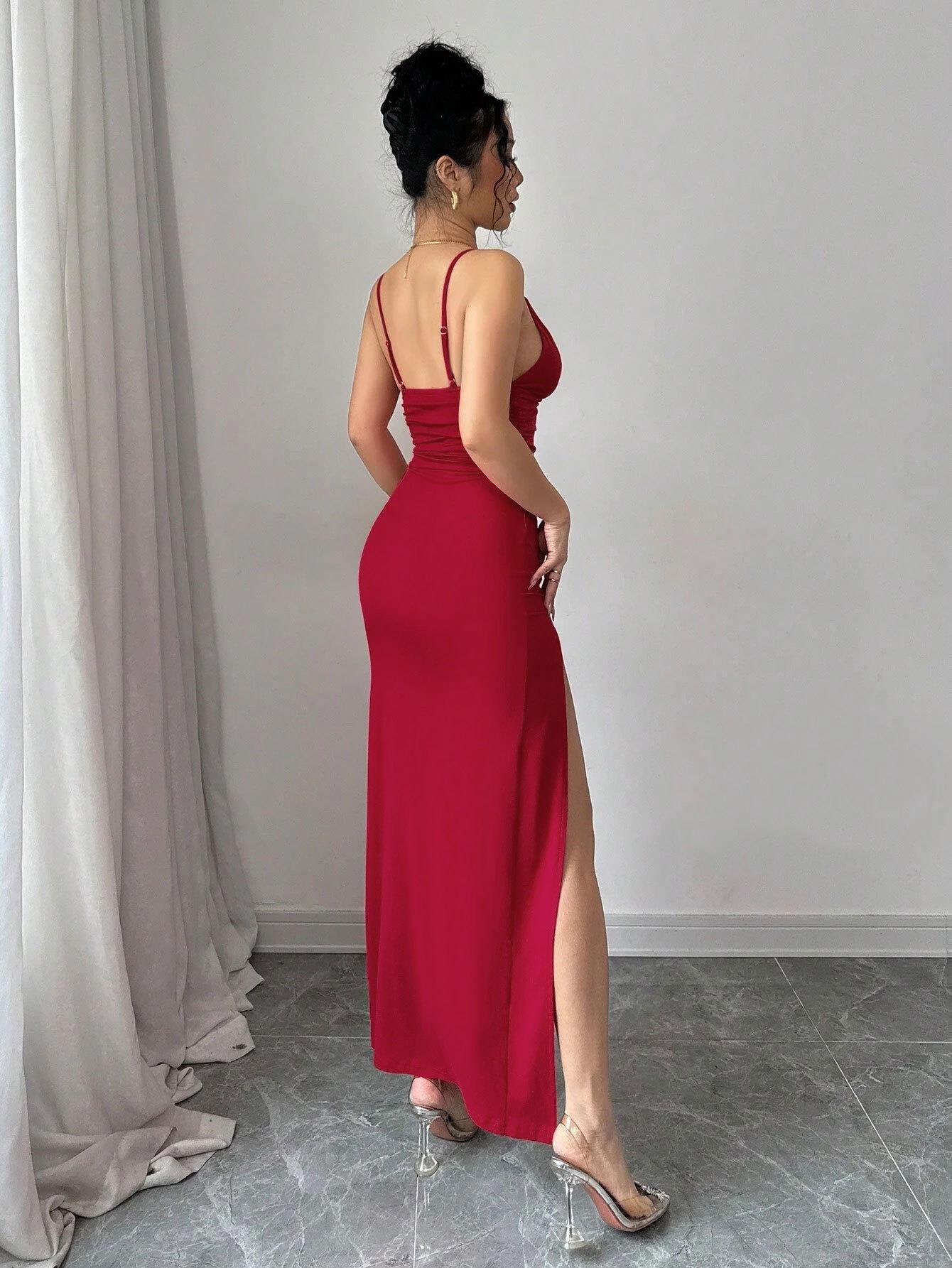 • Women Sexy Red Bodycon Maxi Dress Polyester Elastane High Slit Ruched U Neck Sleeveless Backless Long Sling Dress For Party Club Nightwear