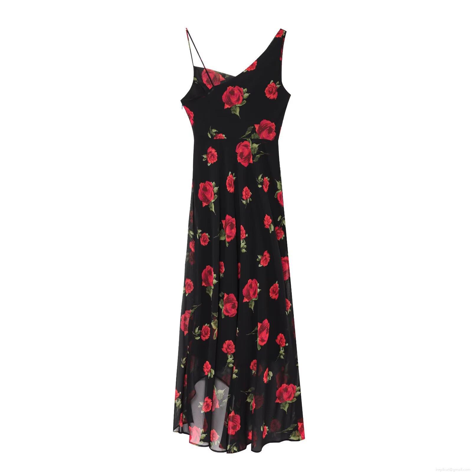 Women Sexy Red Rose Floral Printed Asymmetric Slanted Shoulder Cami Dress Elegant Chiffon Sleeveless High Low Hem Maxi Party Evening Dresses