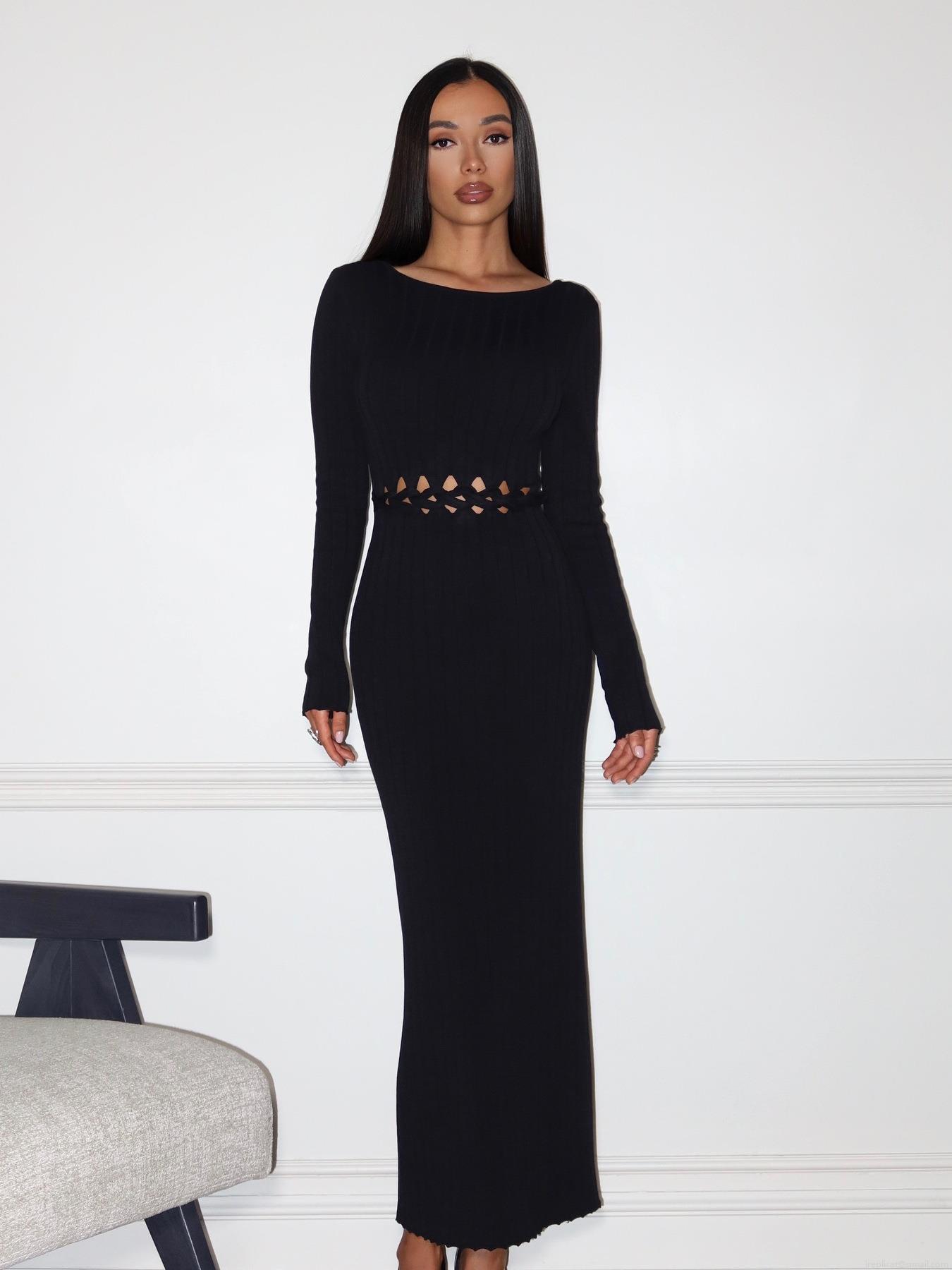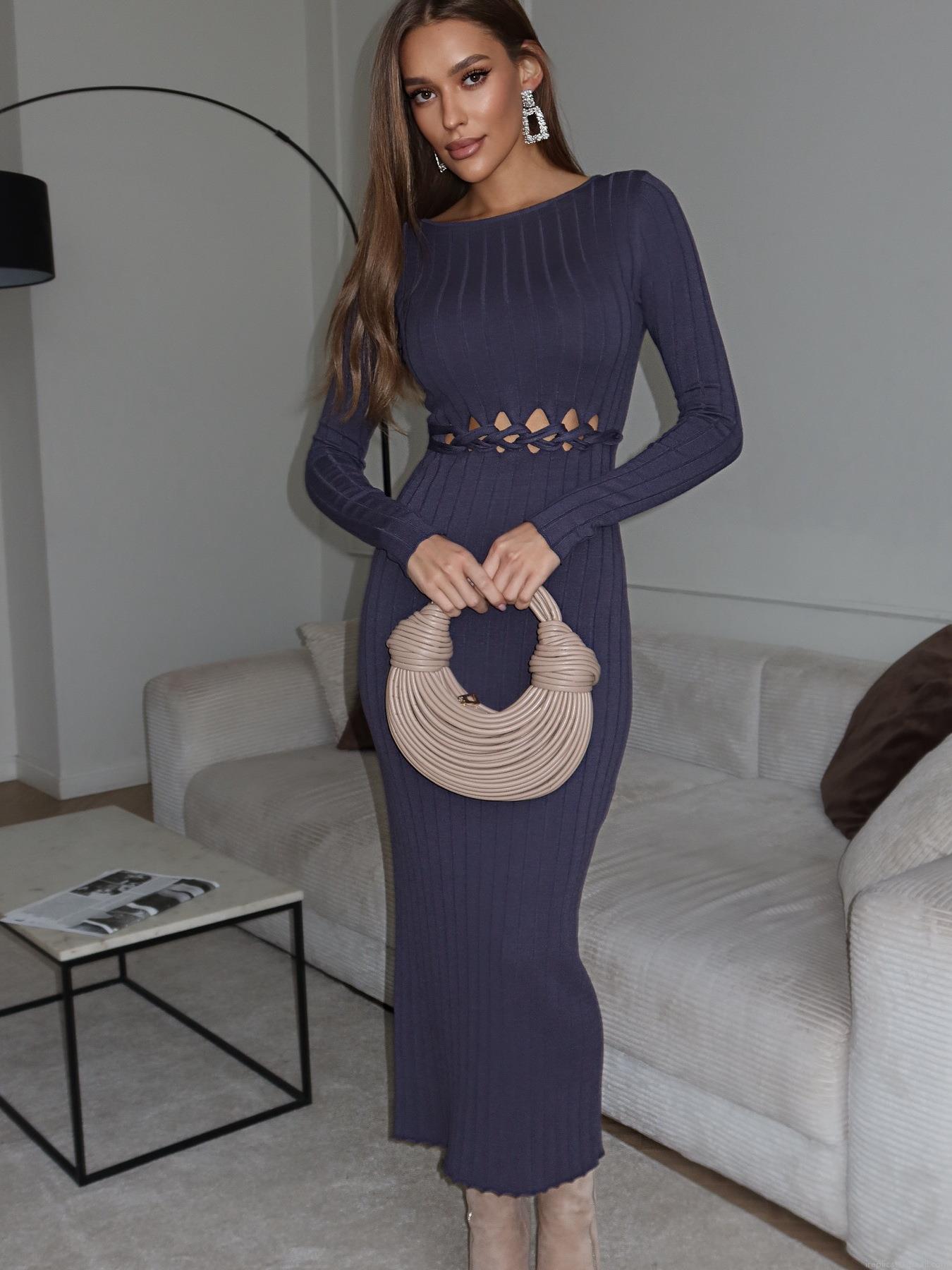 • Women Sexy Round Neck Hollow Out Twist Bodycon Dress Long Sleeve Ribbed Knit Maxi Dress For Party Club Streetwear Autumn Spring Tight Long Dress