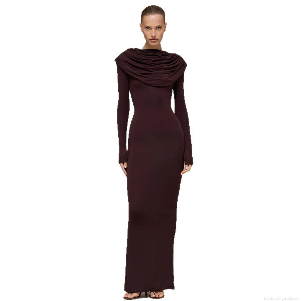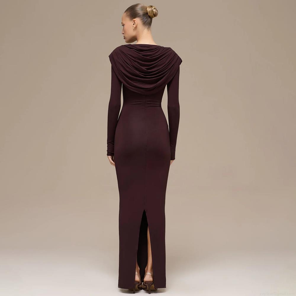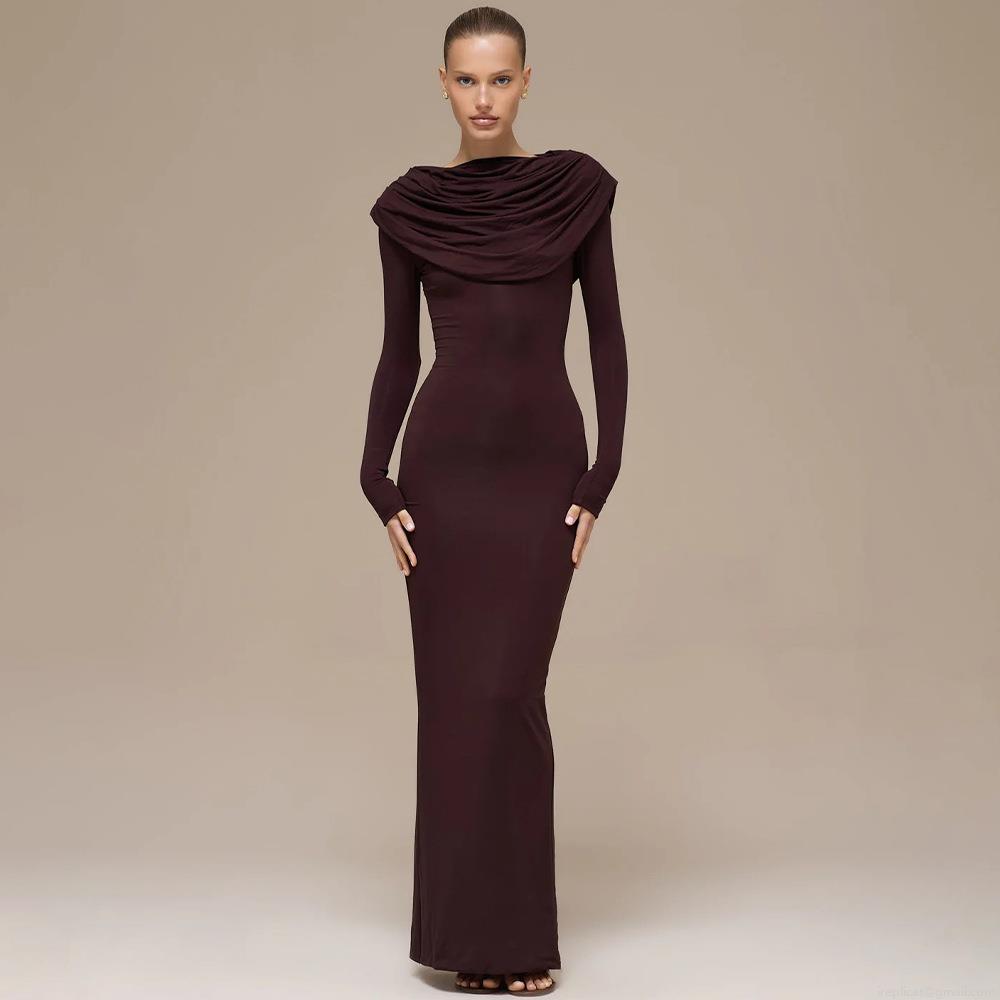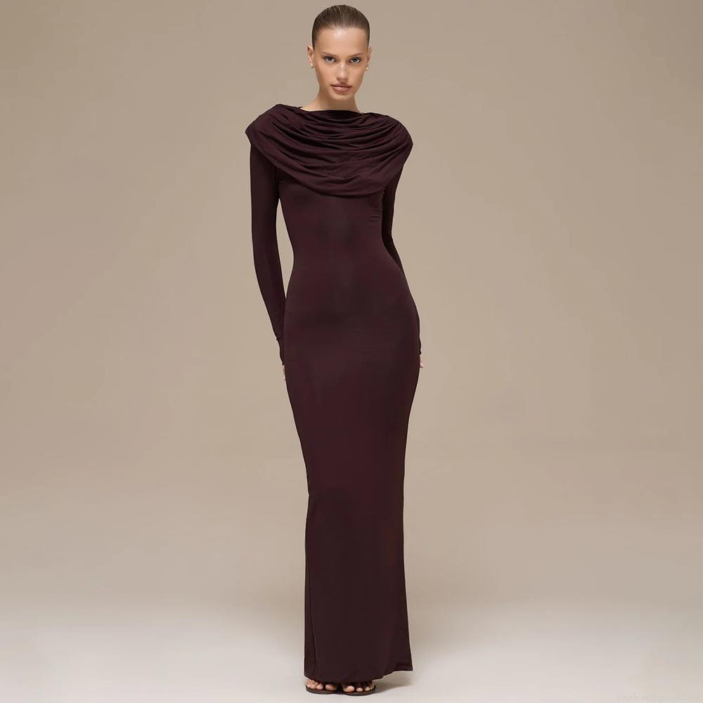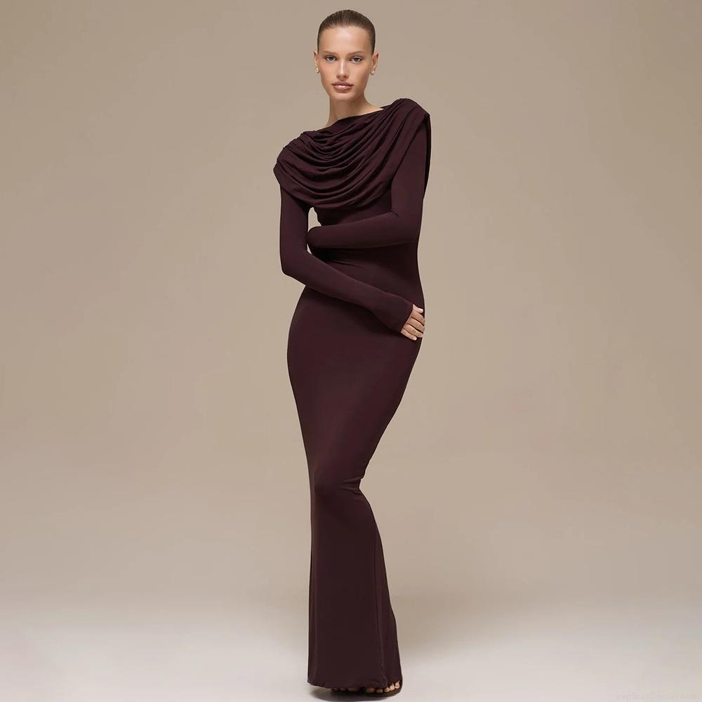 • Women Sexy Ruched Bodycon Maxi Dress Draped Neck Long Sleeve Solid Color Slim Fit Polyester Milk Silk Party Evening Club Long Dress