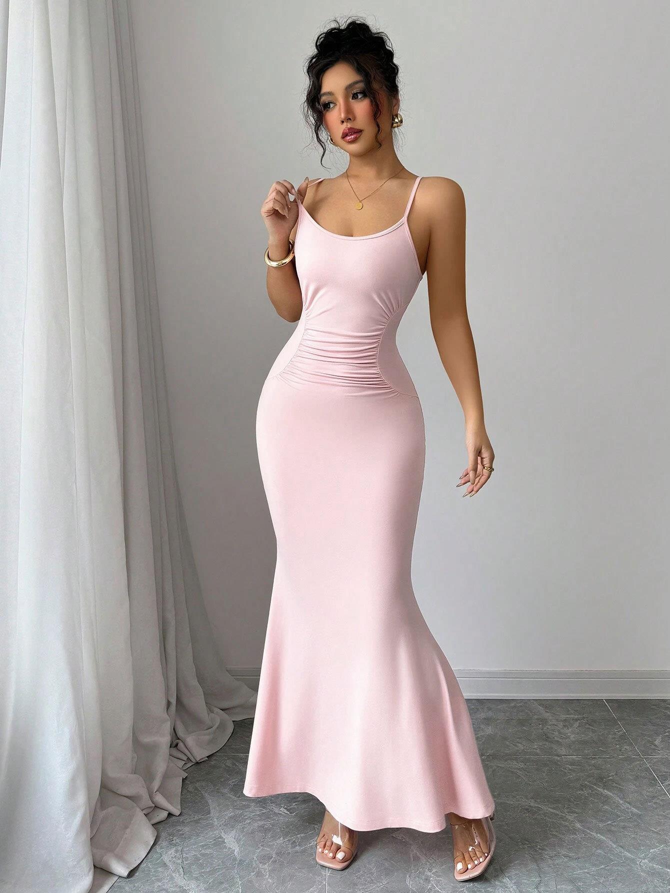 Women Sexy Ruched Cami Fishtail Maxi Dress 95% Polyester 5% Elastane Slim Fit Bodycon Sleeveless Evening Party Dress For Ladies