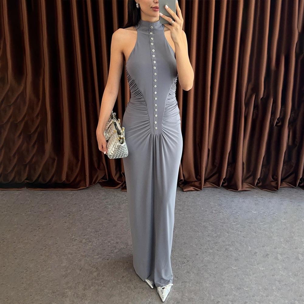 • Women Sexy Ruched Halter Maxi Dress Solid Color Milk Silk Bodycon Long Dress With Buttons Slim Fit Sleeveless Backless Party Club Dress For Ladies