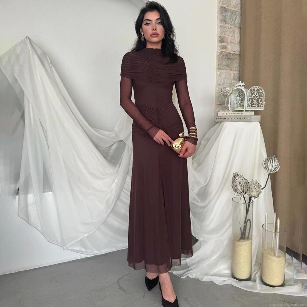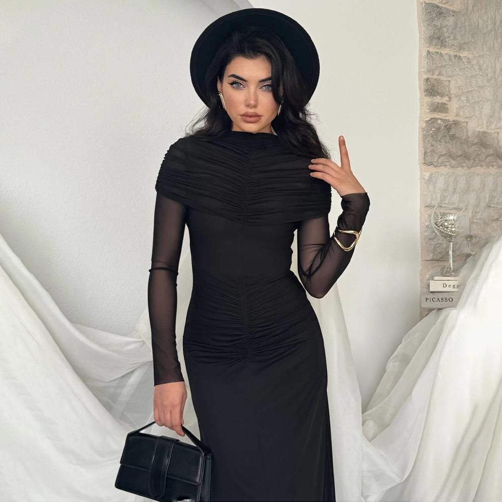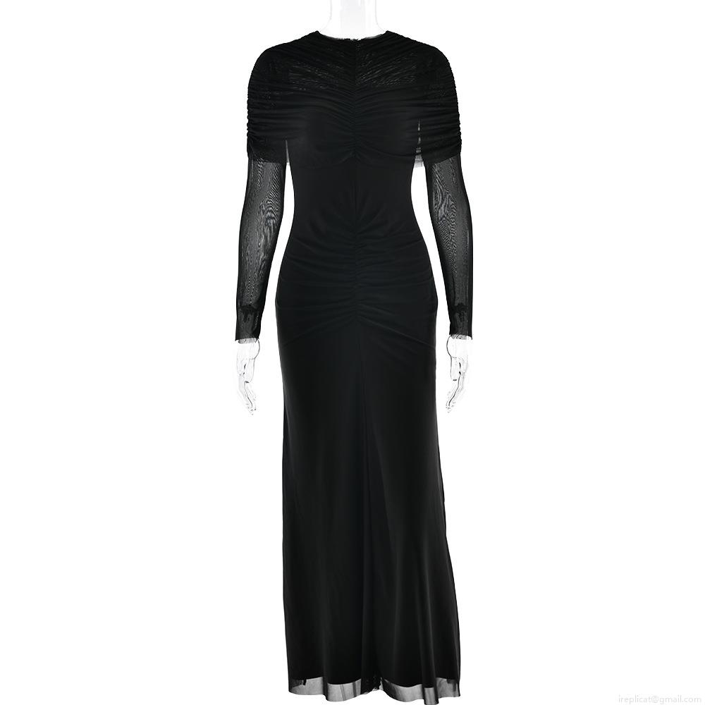 Women Sexy Ruched Maxi Dress Elegant Mesh Long Sleeve Bodycon Party Evening Dress Polyester Milk Silk Slim Fit Long Formal Wedding Guest Gown