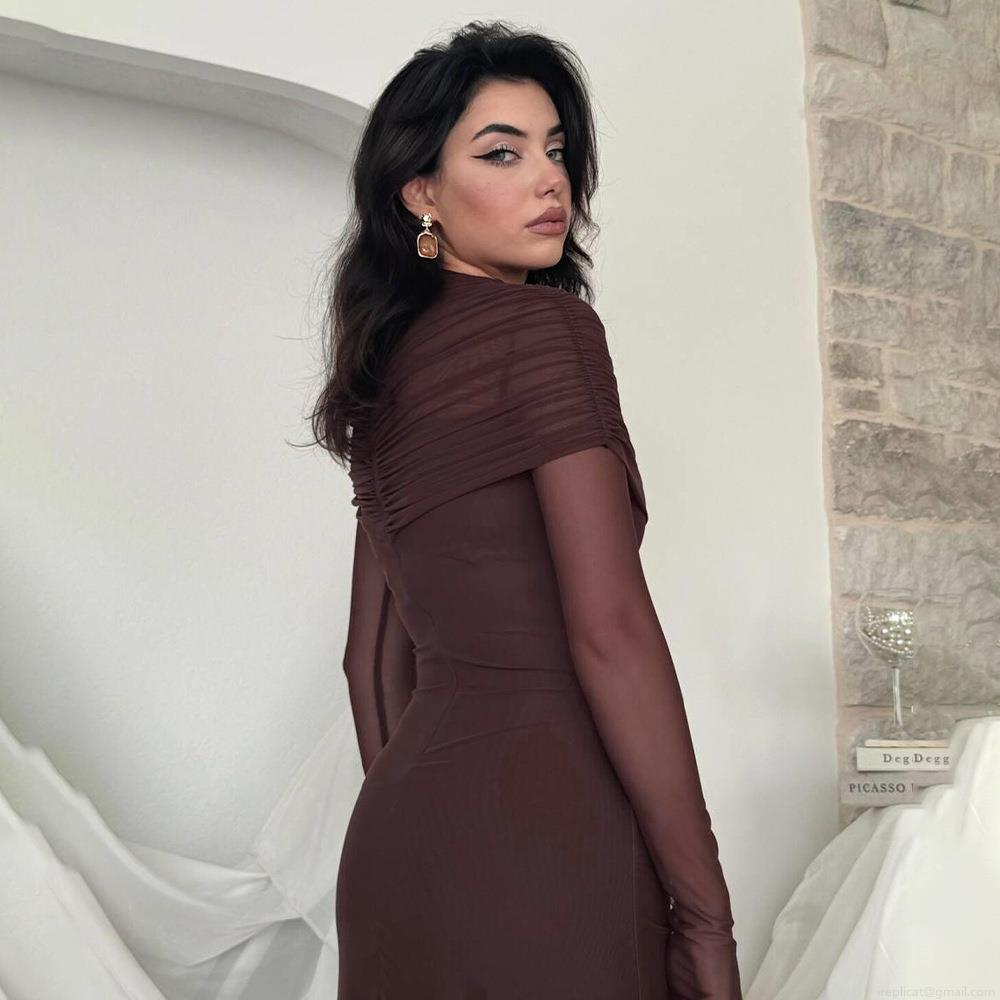 • Women Sexy Ruched Maxi Dress Elegant Mesh Long Sleeve Bodycon Party Evening Dress Polyester Milk Silk Slim Fit Long Formal Wedding Guest Gown