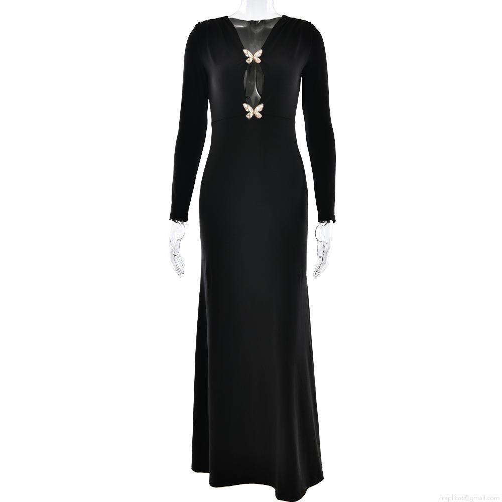 • Women Sexy Ruched Maxi Dress V-Neck Long Sleeve Hollow Out Butterfly Decor Slim Fit Polyester Milk Silk Bodycon Long Dress for Party Evening Clubwear