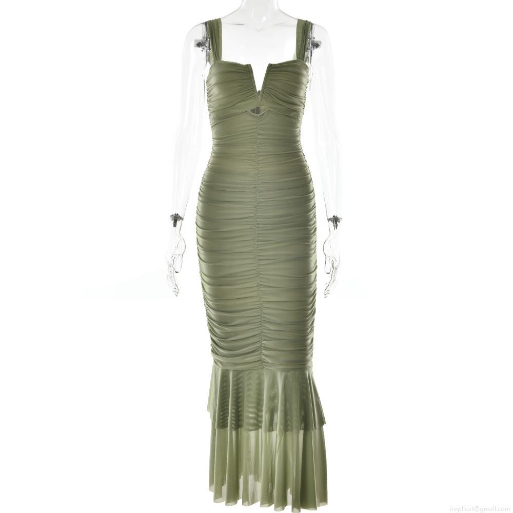 Women Sexy Ruched Mesh Bodycon Mermaid Maxi Dress Sleeveless V-Neck Hollow Out Spaghetti Strap High Waist Evening Party Clubwear Fishtail Dress