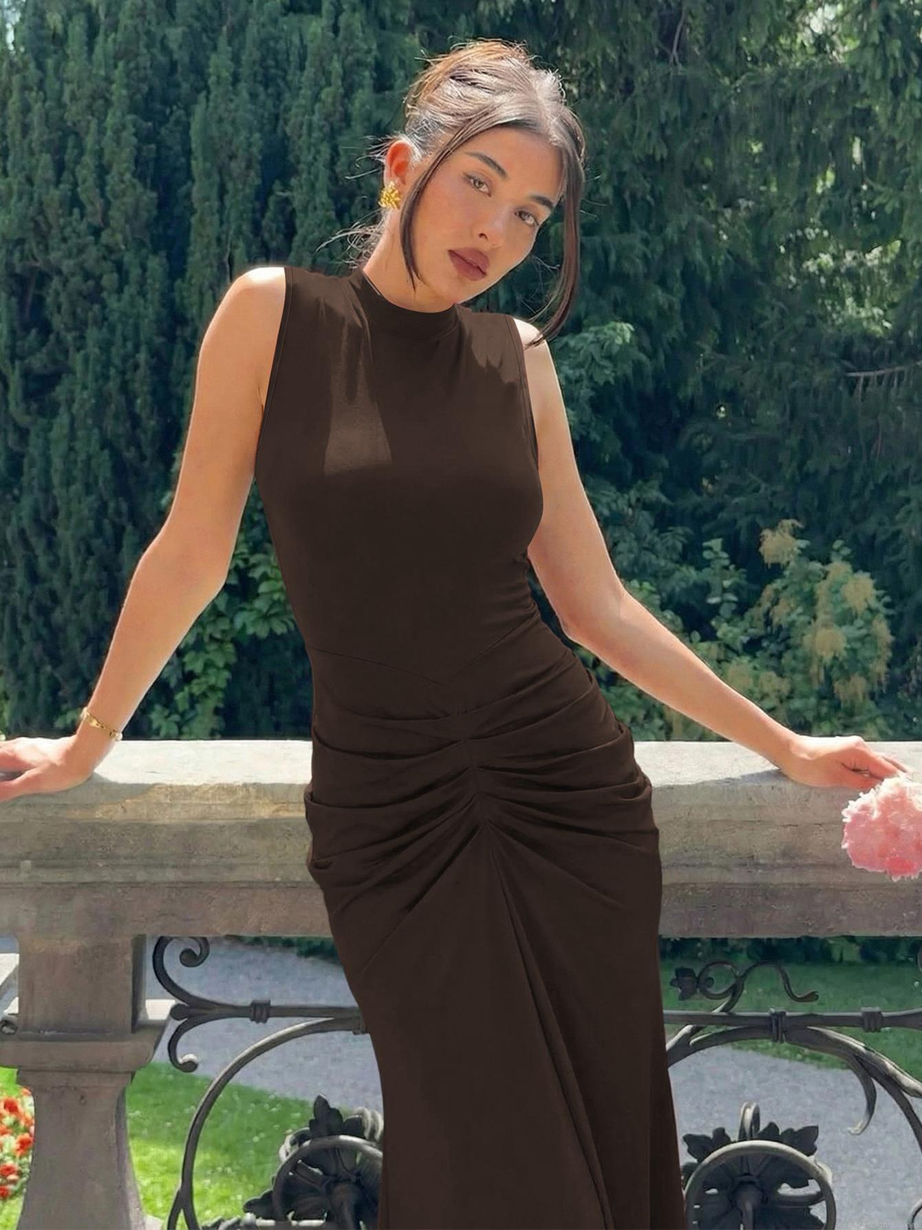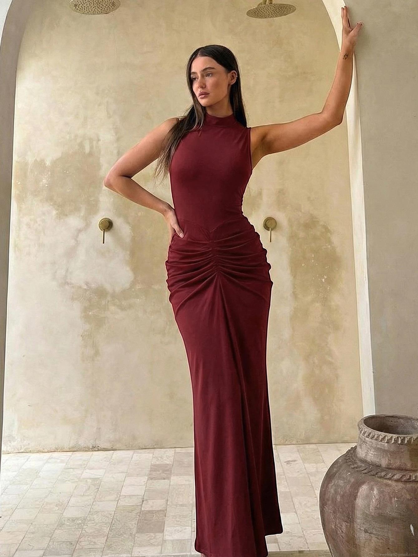 Women Sexy Ruched Sleeveless Maxi Dress Polyester Spandex High Neck Slim Fit Evening Party Gown Elegant Summer Vacation Back Split Long Dress
