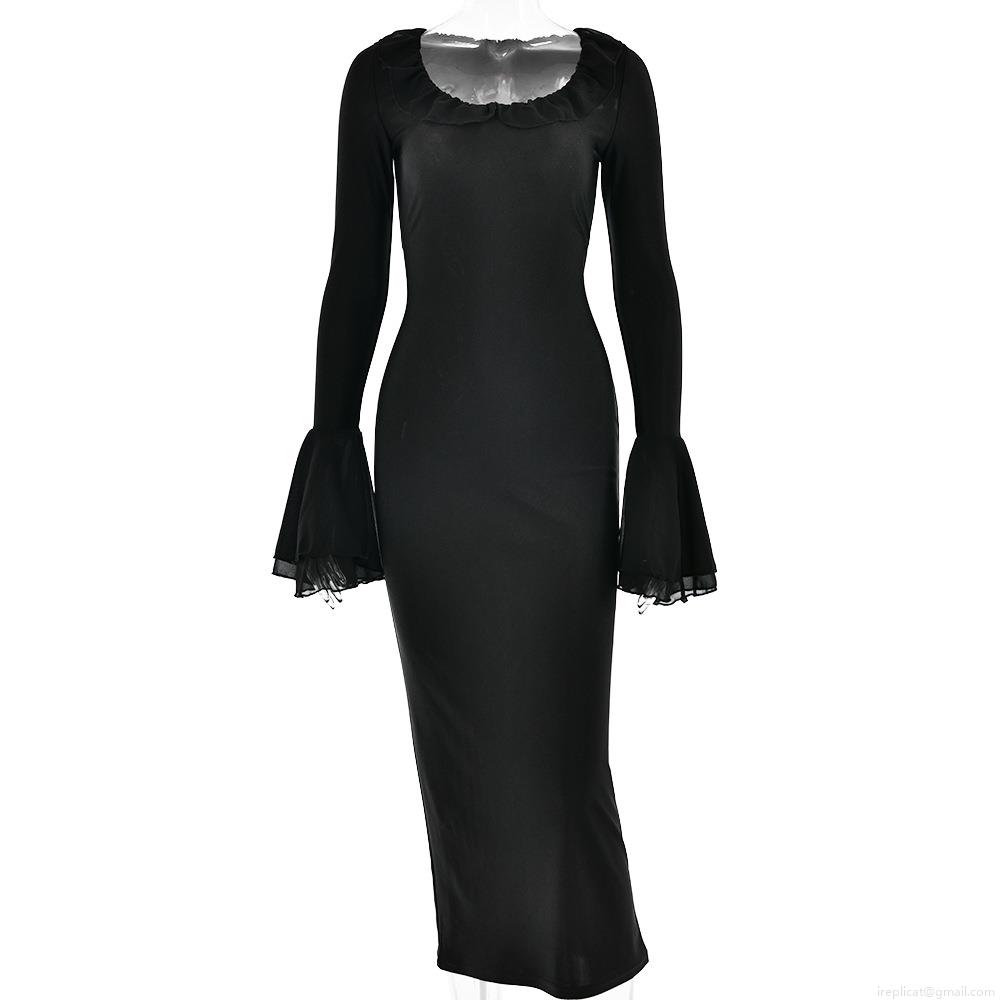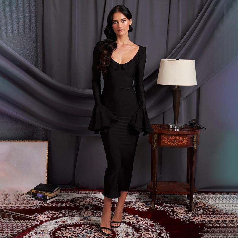 Women Sexy Ruffle V Neck Bell Sleeve Maxi Dress Elegant High Waist Bodycon Fishtail Solid Color Long Evening Party Dress