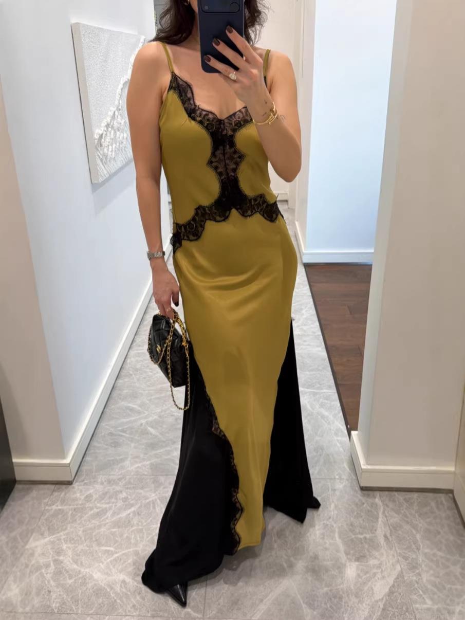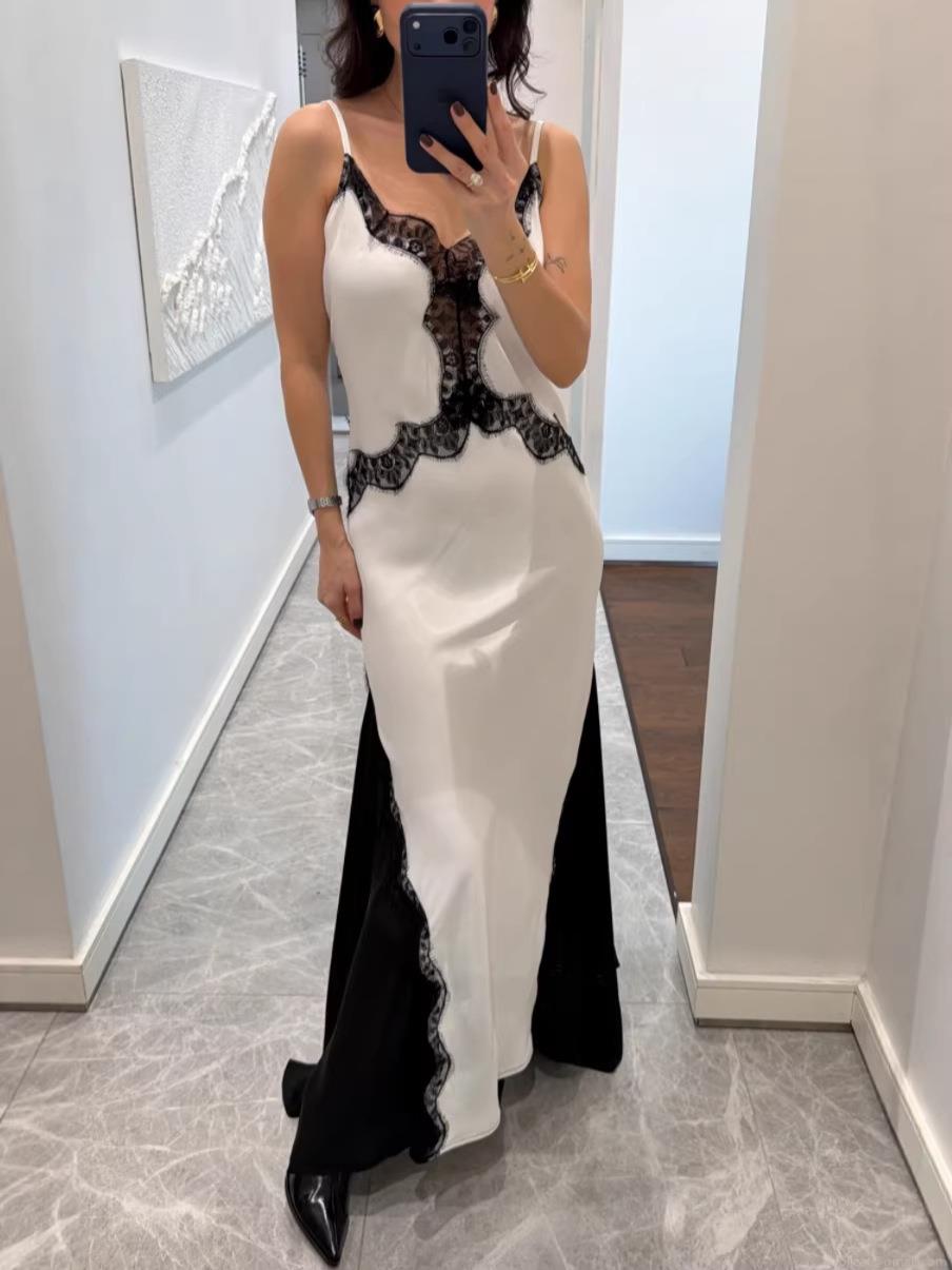 Women Sexy Satin Lace Patchwork Maxi Dress Deep V Neck Backless Spaghetti Strap Bodycon Party Evening Long Dress