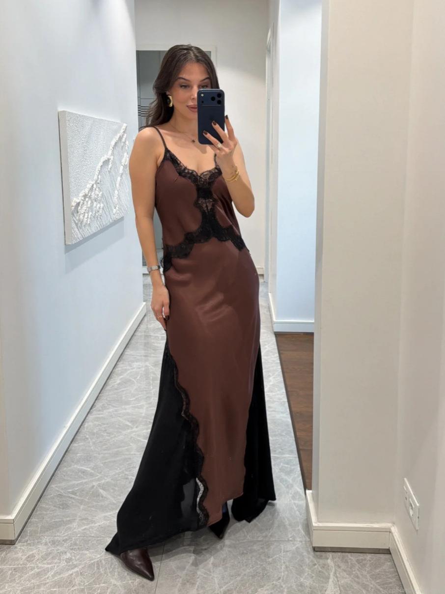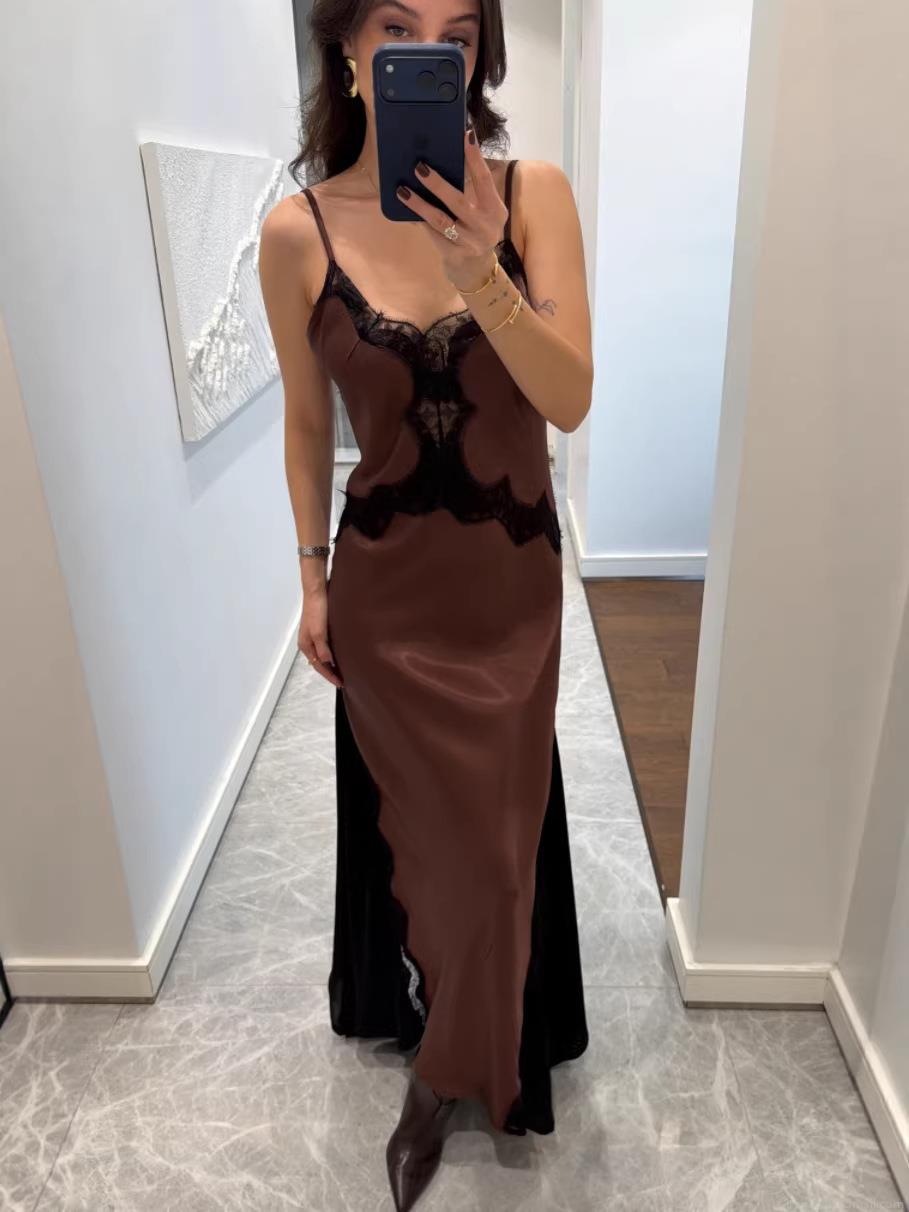 • Women Sexy Satin Lace Patchwork Maxi Dress Deep V Neck Backless Spaghetti Strap Bodycon Party Evening Long Dress
