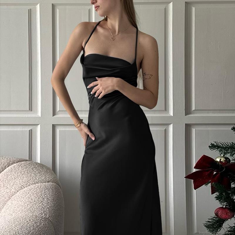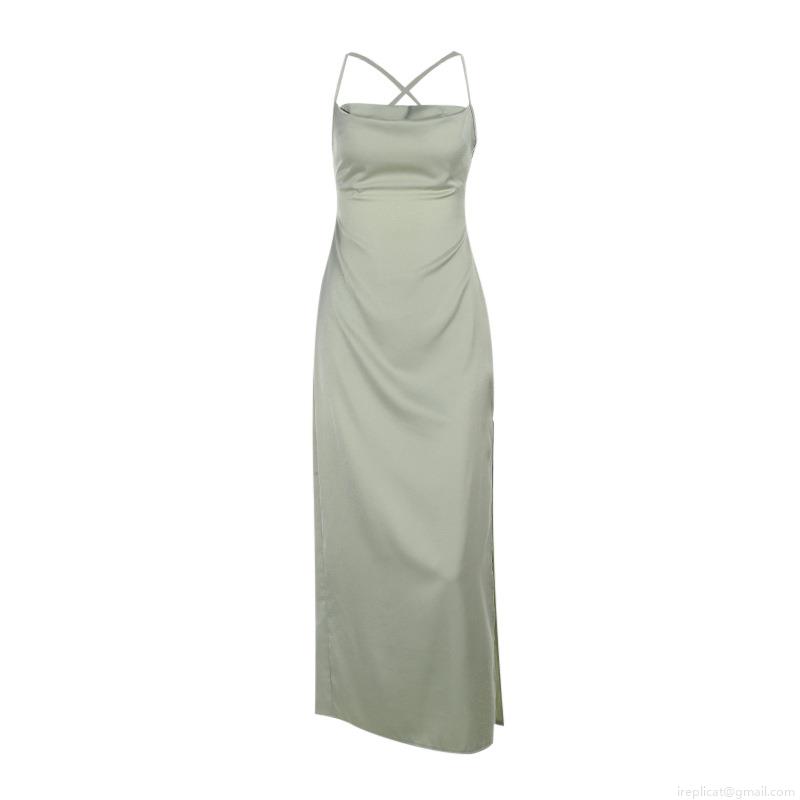 • Women Sexy Satin Slit Slip Maxi Dress Elegant Backless Cowl Neck Cross Strap Silk Texture Long Gown For Party Evening Vacation