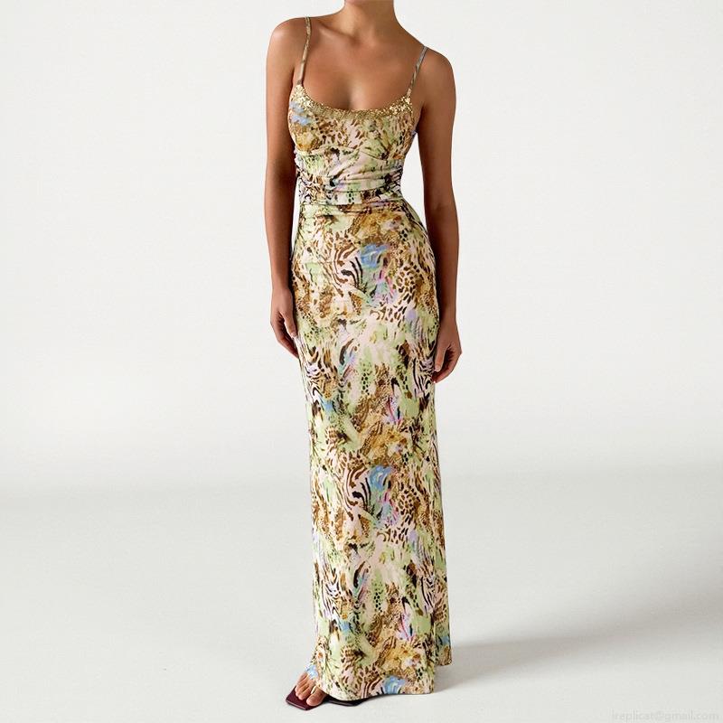 • Women Sexy Sequin Camisole Maxi Dress Polyester Printed Sleeveless Slim Fit U-Neck Beach Holiday Casual Long Sundress