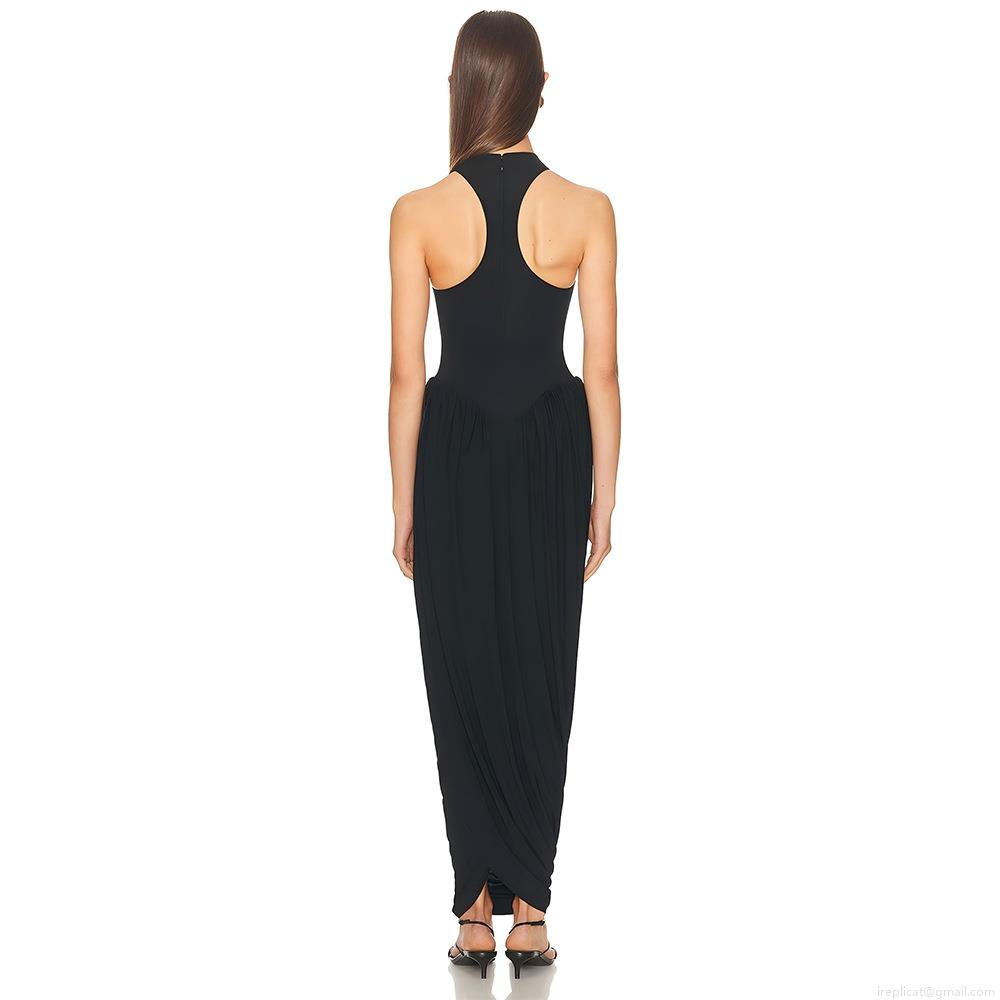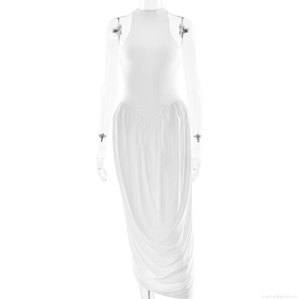 • Women Sexy Sleeveless Halter Neck Maxi Dress Milk Silk High Waist Ruched Pleated Split Long Dress For Evening Party Clubwear Summer Streetwear