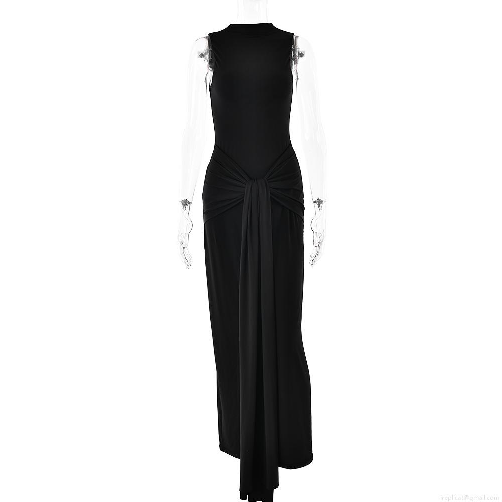 Women Sexy Sleeveless Stand Collar Maxi Dress Milk Silk Solid Color Slim Fit Bodycon Evening Party Long Dress With Waist Tie Knot Detail