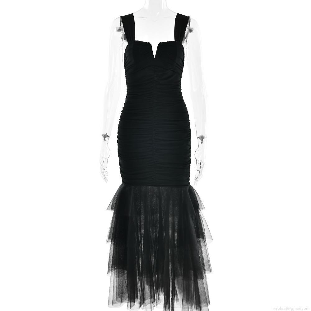 Women Sexy Spaghetti Strap Maxi Dress Ruched Bodycon Fishtail Mesh Patchwork Sleeveless V Neck Evening Party Elegant Long Dress Clubwear