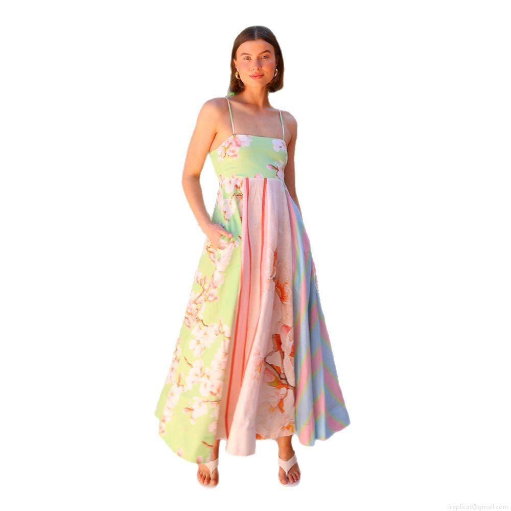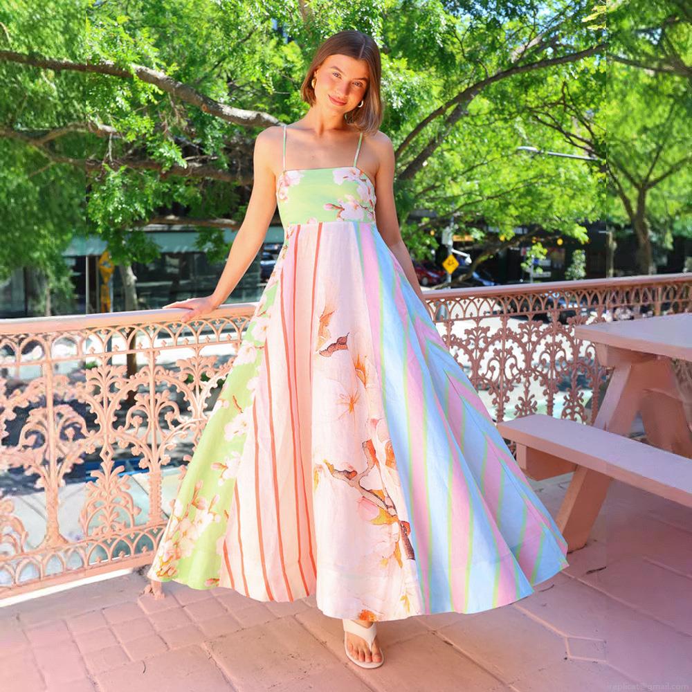 • Women Sexy Spaghetti Strap Patchwork Floral Maxi Dress Elegant Backless Print Flare Long Sundress Summer Vacation Party Dress with Pockets
