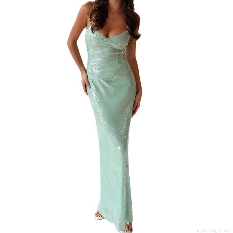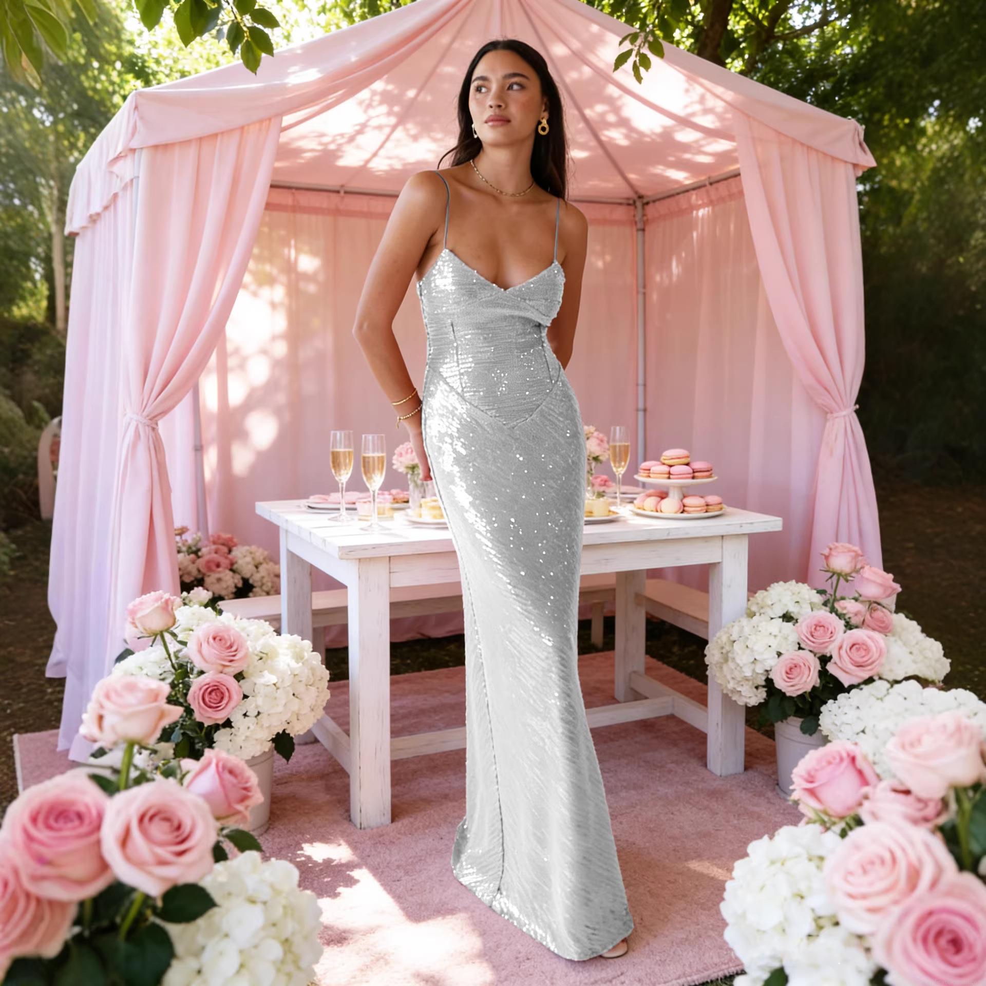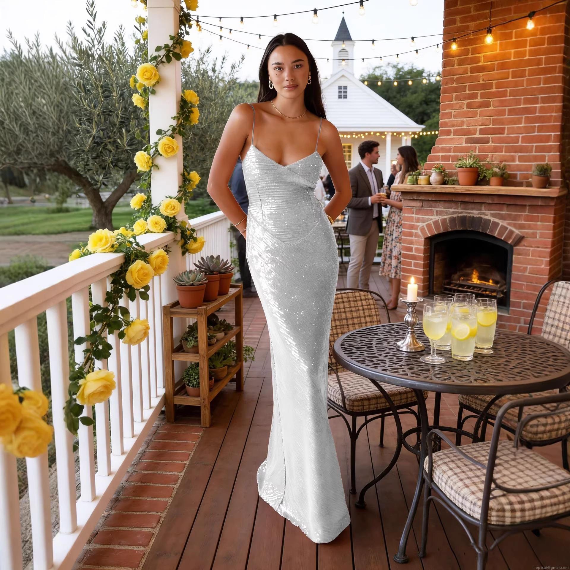 • Women Sexy Spaghetti Strap Sequined Maxi Dress Backless V-Neck Slim Fit Evening Gown For Wedding Guest Prom Party Vacation Mint Green Silver Formal Dress