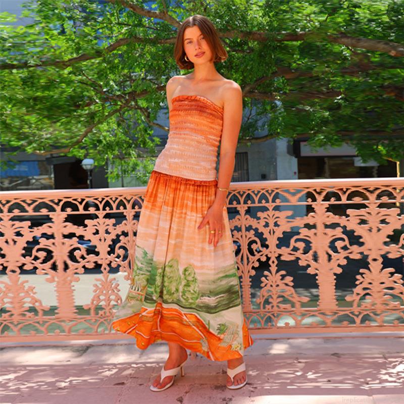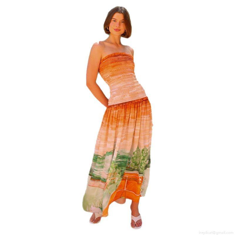 • Women Sexy Strapless Backless Gradient Maxi Dress Polyester Landscape Print Bohemian Pleated Large Swing Vacation Beach Sundress