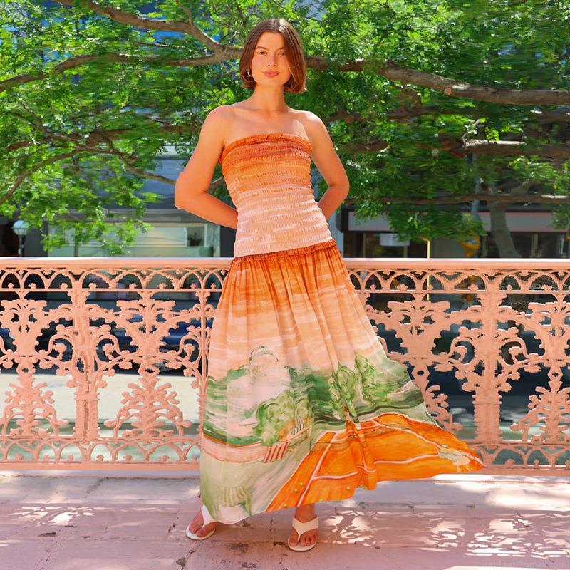 Women Sexy Strapless Backless Gradient Maxi Dress Polyester Landscape Print Bohemian Pleated Large Swing Vacation Beach Sundress