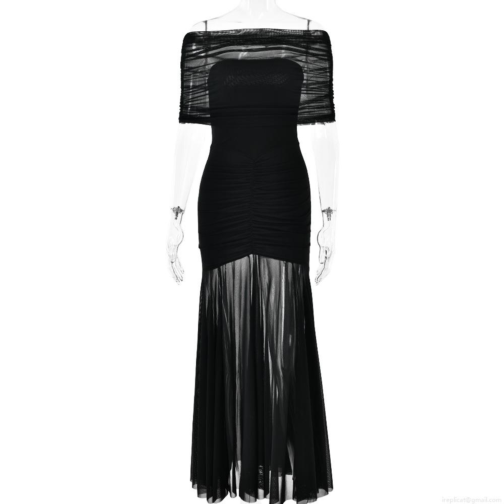 • Women Sexy Strapless Maxi Dress Polyester Mesh Splicing Backless Ruched Bodycon Party Evening Gown For Date Night Summer Fashion