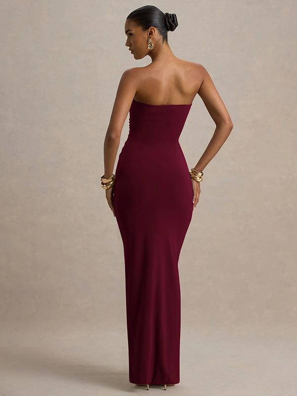 • Women Sexy Strapless Ruched Maxi Dress 2025 Elegant Solid Color Slim Fit Bodycon Evening Party Gown Milk Silk Polyester Formal Dress