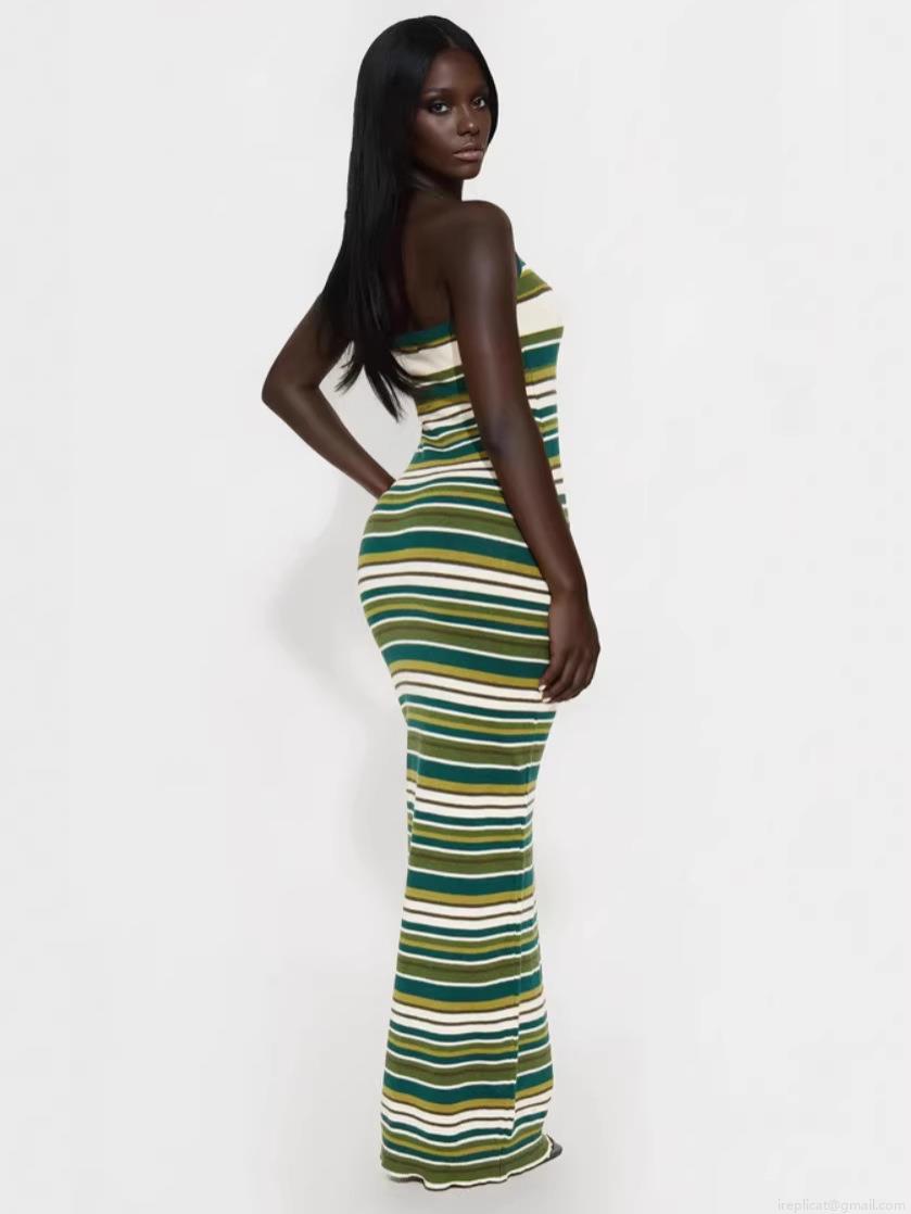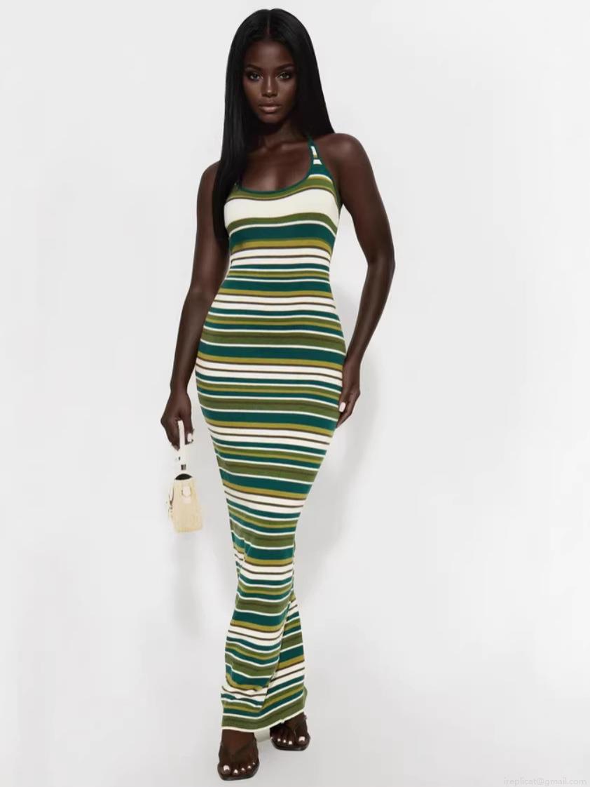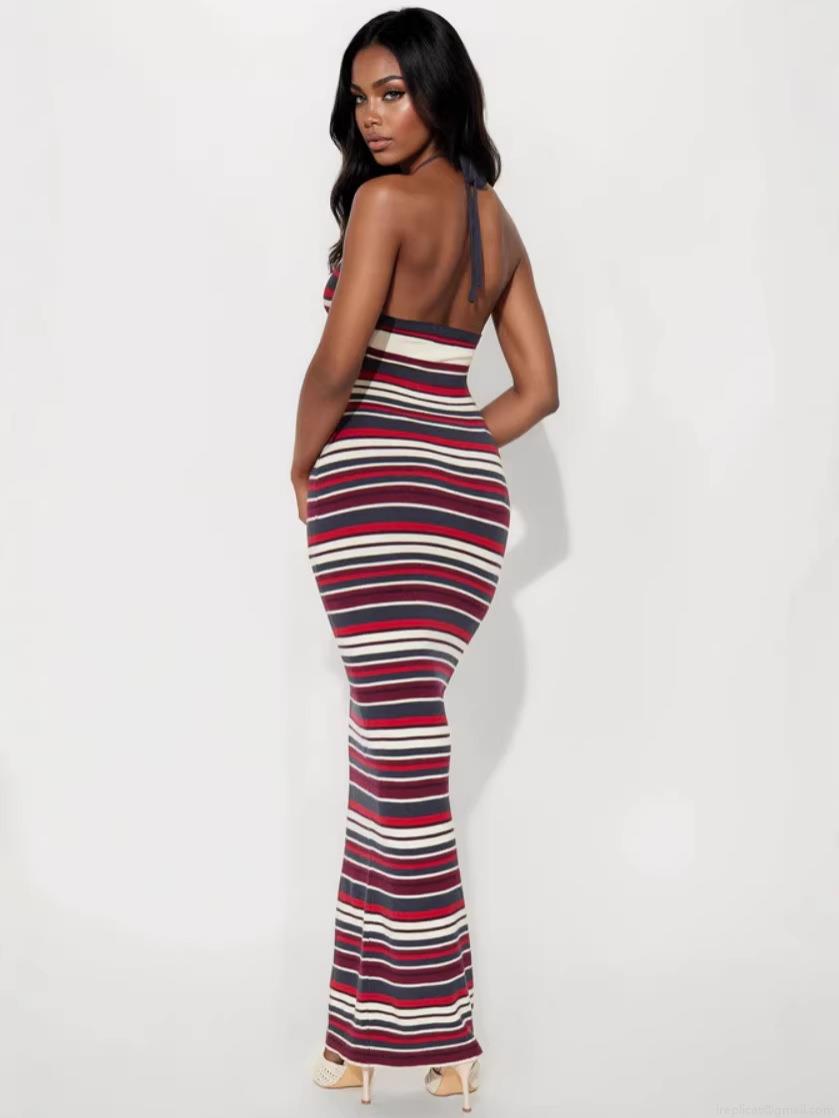 • Women Sexy Striped Halter Maxi Dress Knitted Slim Fit Backless Bodycon Long Dress For Summer Casual Beach Party Sleeveless Cotton Blend Knitwear