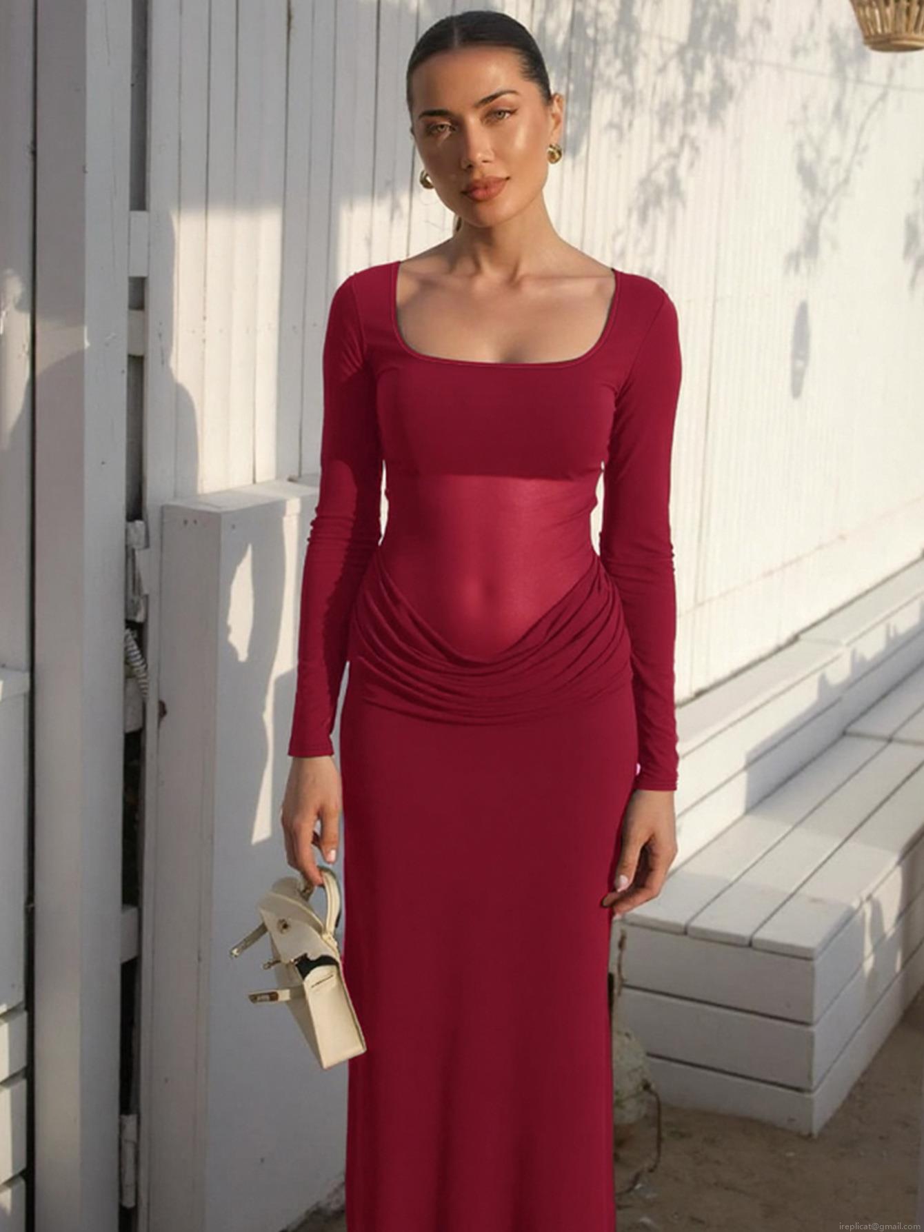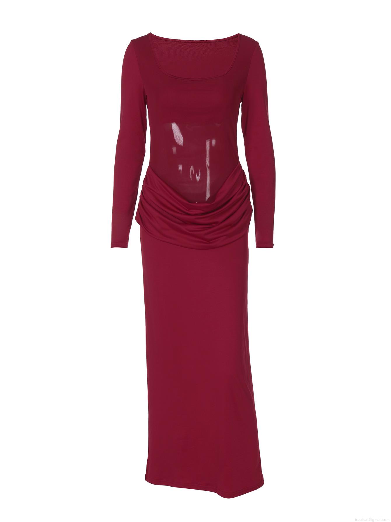 • Women Sexy U-Neck Mesh Patchwork Ruched Maxi Dress Slim Fit Long Sleeve Hollow Out Evening Party Nightclub Bodycon Elegant Long Dress