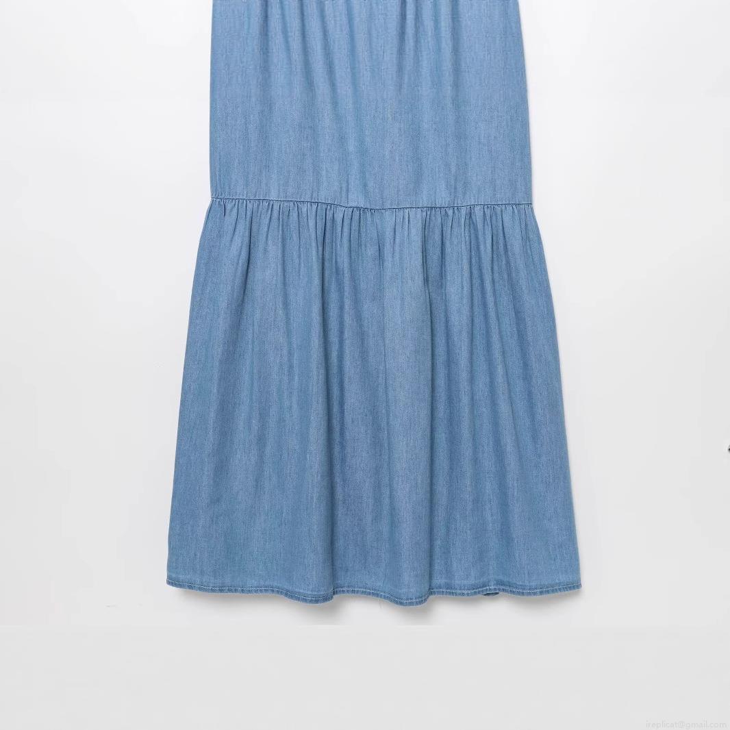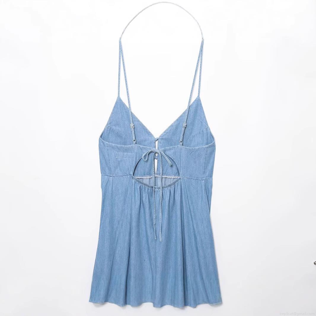 • Women Sexy V Neck Backless Bow Tie Maxi Dress Cotton Polyester Blend Denim Style Spaghetti Strap Tiered Ruffled Hem Summer Casual Vacation Elegant Dress