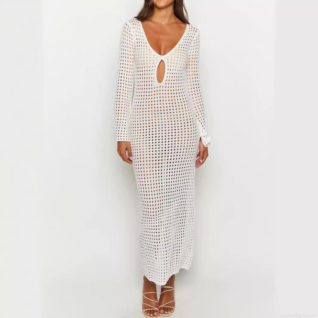 • Women Sexy V Neck Hollow Out Crochet Maxi Dress Long Sleeve High Waist Keyhole Cutout Beach Vacation Bikini Cover Up Polyester Knit Dress